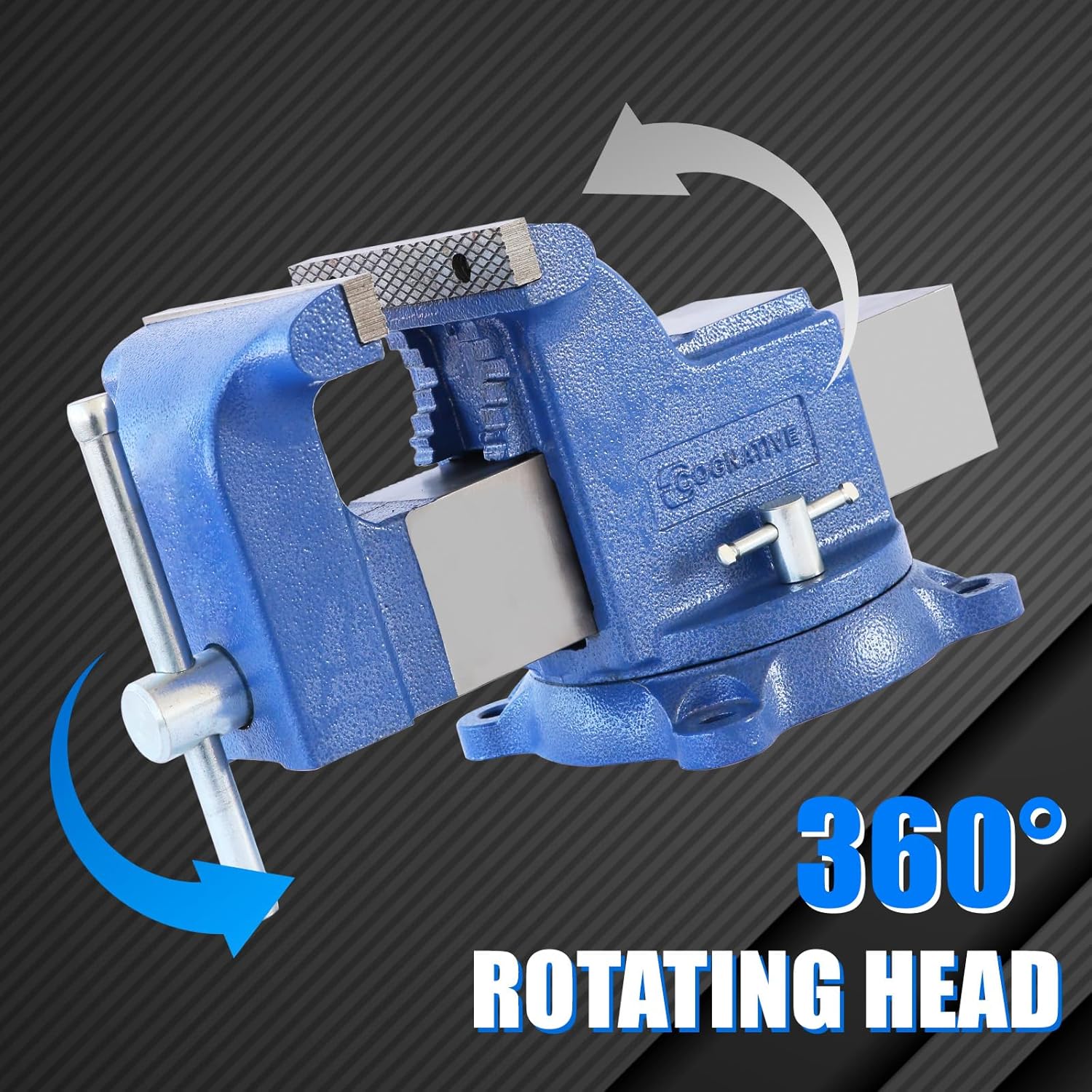 The COGNATIVE 6-Inch Precision Swivel Bench Vise has a 360-degree swivel base and mounts to a workbench to provide clamping action. The 360-degree swivel base adjusts the direction of the jaws for proper placement. Hand-tightening the two lock knobs on the base secures its position. The body is made of cast steel and has a black painted finish for mild corrosion protection. A flat portion on the body acts as a reinforced anvil and an additional work surface. The top jaws are made of hardened steel and can be replaced when worn, and the built-in pipe jaws are cast steel. Body Material: PSI 60,000 ductile iron Jaw width: 6 inch/150mm Opening: 6.1 inch/155mm Throat Depth:3.4 inch/87mm Item Weight: 33.3 lbs Size: 15.0 x 6.7 x 8.2 Inch Color: Blue