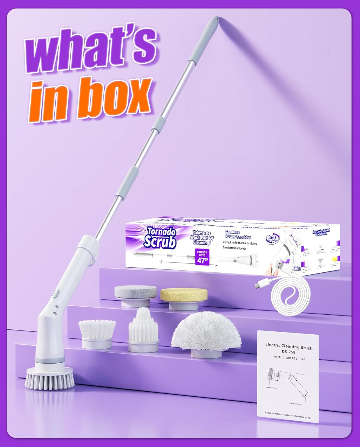 | Included Components | 1 eletric spin scrubber, 1 manual, 1 type-c charging cable, 6 replace heads |
