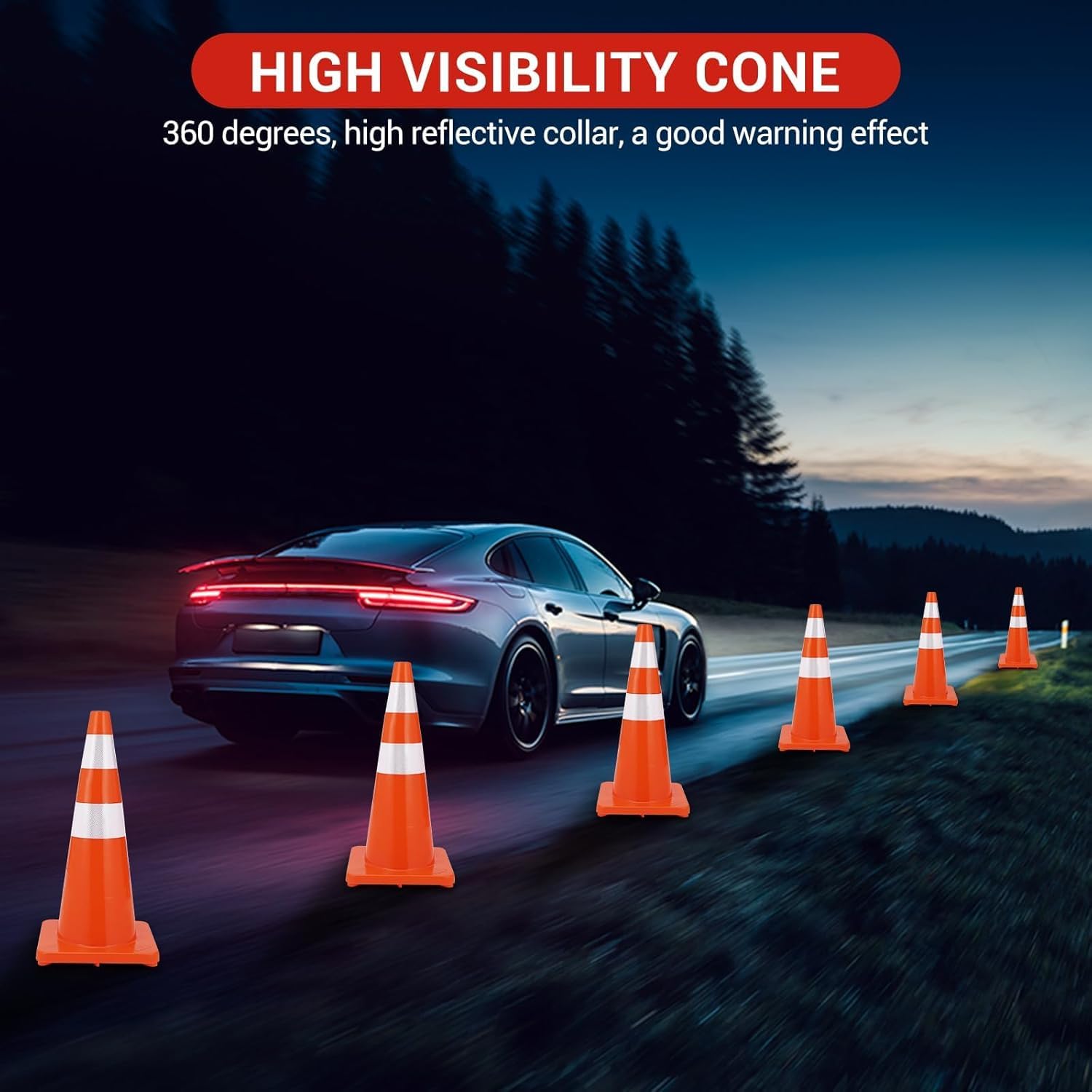 The Traffic Safety Cones are engineered to be the reliable, high-visibility solution for a multitude of safety, warning, and traffic control needs. Whether you are a professional contractor securing a work zone, an event organizer directing crowds, or a homeowner marking a driveway hazard, our premium cones deliver unmatched durability, stability, and visibility. Built to withstand the elements and perform consistently, they are the essential safety equipment you can count on.The cone body is made from brilliant fluorescent orange material for optimal daytime contrast. Second, we integrate a high-intensity 360-degree reflective collar. This collar captures and reflects light from headlights and ambient sources, making the cone glow brightly at night for clear, far-distance visibility. The top hole is compatible with standard warning flags or lights for enhanced signaling.The hollow interior design allows cones to nest perfectly inside one another. This means a 12-pack stores in the space of just a few cones, making storage in your truck, garage, or warehouse incredibly space-efficient. Transportation and deployment are quick and effortless. Simply unstack and place them where needed.Choose the perfect pack for your requirements: The versatile 18-inch cones (6 or 12-Pack) are ideal for indoor/outdoor events, parking control, minor road work, and home use. For high-traffic areas, freeways, or situations requiring greater visibility over obstacles, opt for the larger 28-inch cones (6 or 12-Pack).