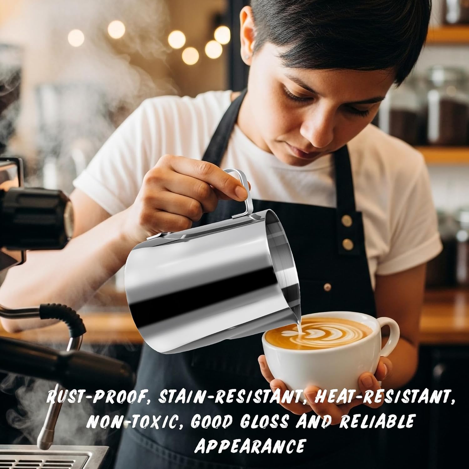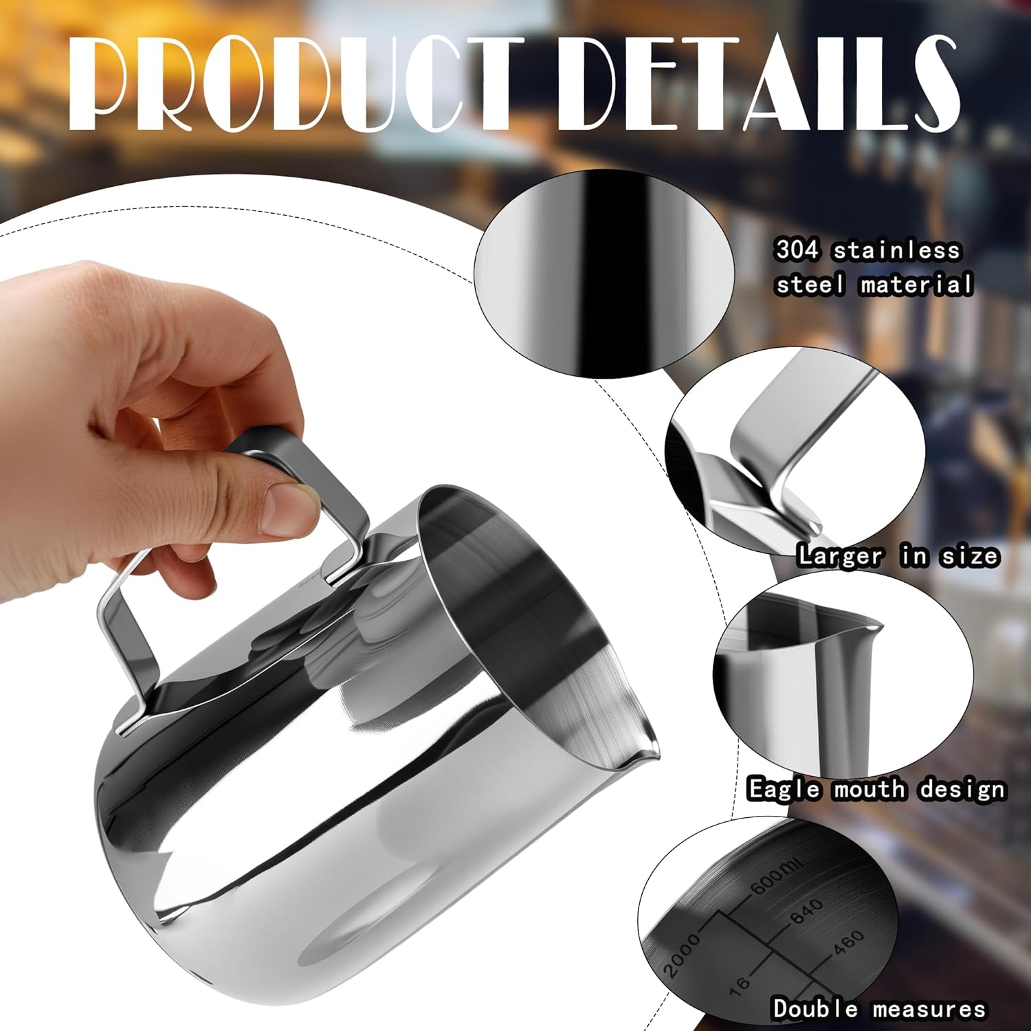 ✅Milk Steamer Cup Product Details: Material: 11.3 x 9 cm/ 4.47 x 3.54 inch Size: stainless steel Color: silver Quantity: 6 pieces ✅Milk Frother Cup Special Feature: the milk frother pitcher bulk features clear markings on the inner wall, making it easy to control the amount and ratio of liquid, thus enhancing the taste of your beverage. The slender, curved spout design reduces spillage, helping you easily create delicate and exquisite latte art patterns. The handle design conforms to the shape of your hand, providing a comfortable and stable grip, and making it easier to control the force and angle when pouring milk ✅Packaging: 6 x Frothing Pitcher