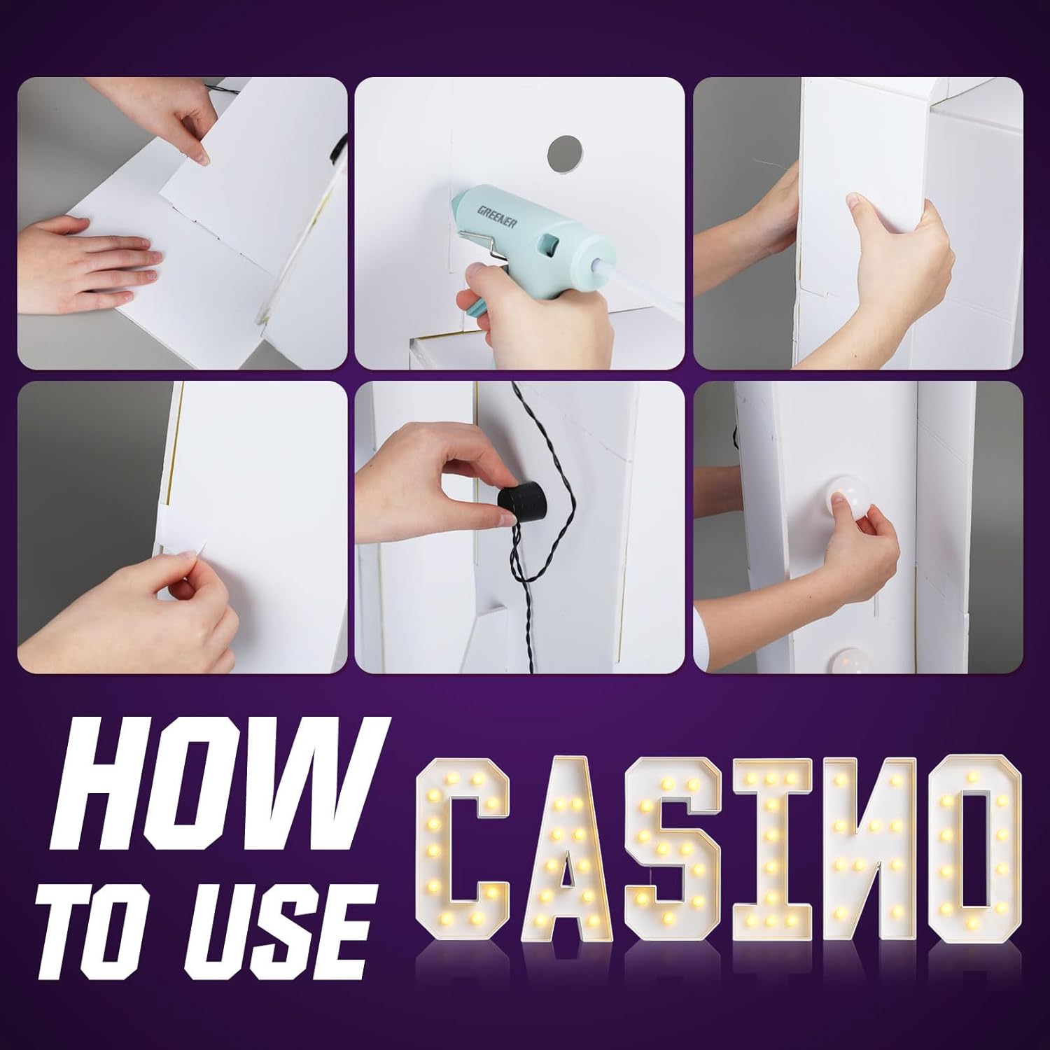 Features: Versatile Decor: These casino LED word light signs can also elevate the mood of different parties and occasions. They are the nice mood setter, whether you're hosting a poker, a Vegas themed party, or even a game themed birthday bash. Specifications: Material: reinforced foam board Color: white Size: about 48 inches/ 121.92 cm Package includes: 6 x Light up letters Notes: Manual measurement, please allow slight errors on size. Warm reminder: For safety and longer life, always fully unfold the bulbs before use. Bundling them can cause overheating and hazards. The color may exist a slight difference due to different screen displays