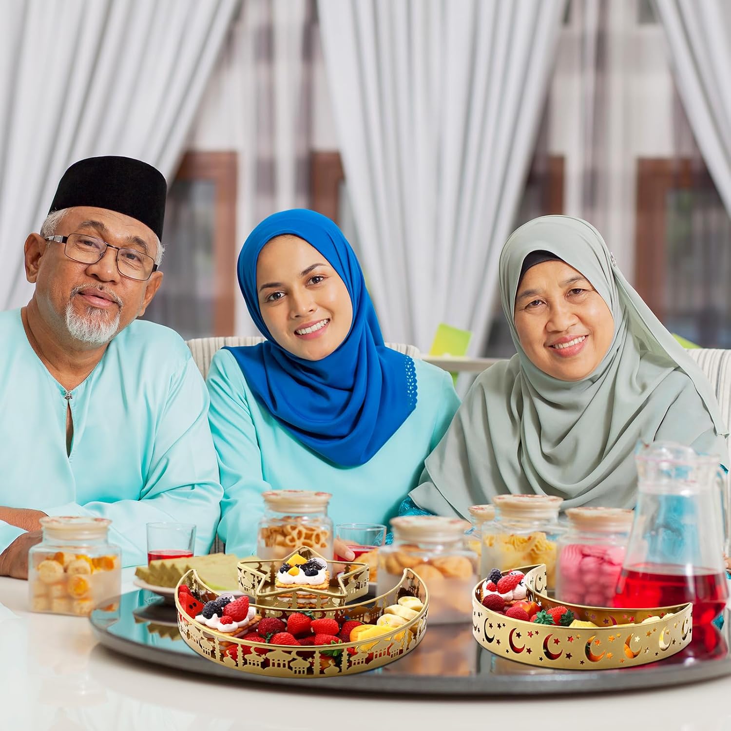 Features: Our Eid Mubarak dessert platters are designed to add a beauty to many events. Their captivating golden color and intricate designs ensure a touch of elegance and a festive atmosphere. Moreover, they seamlessly blend with many party decorations, providing that the gatherings boast elegance on such a holy occasion. Surprise your loved ones this Eid season with our Ramadan metal platters. Unlike other ordinary presents, each tray in this set not only creates Ramadan's atmosphere but also shows your attention to detail in choosing a present that is festive, stylish, and meaningful. Specifications: Material: iron Color: gold Size: as pictures shown Package includes: 3 x Moon shape pastry trays 3 x Star shape pastry trays Notes: Manual measurement, please allow slight errors on size. The color may exist a slight difference due to different screen displays.