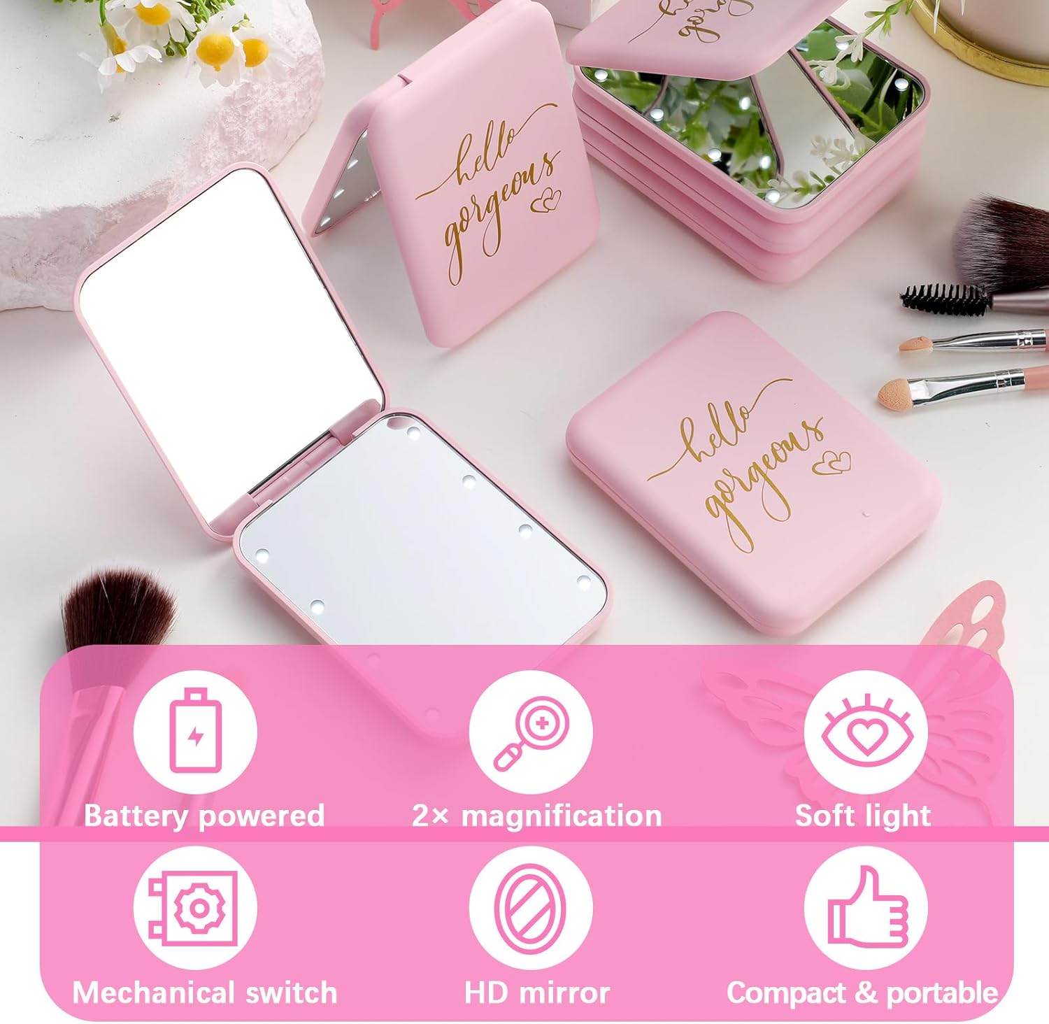 Features: Our travel mirror is equipped with 8 bright LED fluorescent lights, which will reach maximum brightness when you turn on the button placed on the back, allowing you to better show the most realistic look in dimly lit scenarios, and even in such environments, it can perfectly complement your beauty. Our compact mirror is lightweight and compact, easy to carry, with a small built-in battery, which can help you save the time of charging, so that you can watch your facial makeup meticulously all the time. It's the perfect companion for you during travel. Whether you're in between makeup sessions or out and about, it can create a flawless look for you, so you can feel confident and beautiful on any occasion. Specifications: Material: plastic Color: pink Size: approx. 3.35 x 2.52 x 0.49 inch/ 8.5 x 6.4 x 1.25 cm Package includes: 6 x Compact mirror Notes: Manual measurement, please allow slight errors on size. The color may exist a slight difference due to different screen displays The battery life is related to the frequency and length of use of the product. If the frequency of use is high, and one-time use long, the battery life will be relatively short
