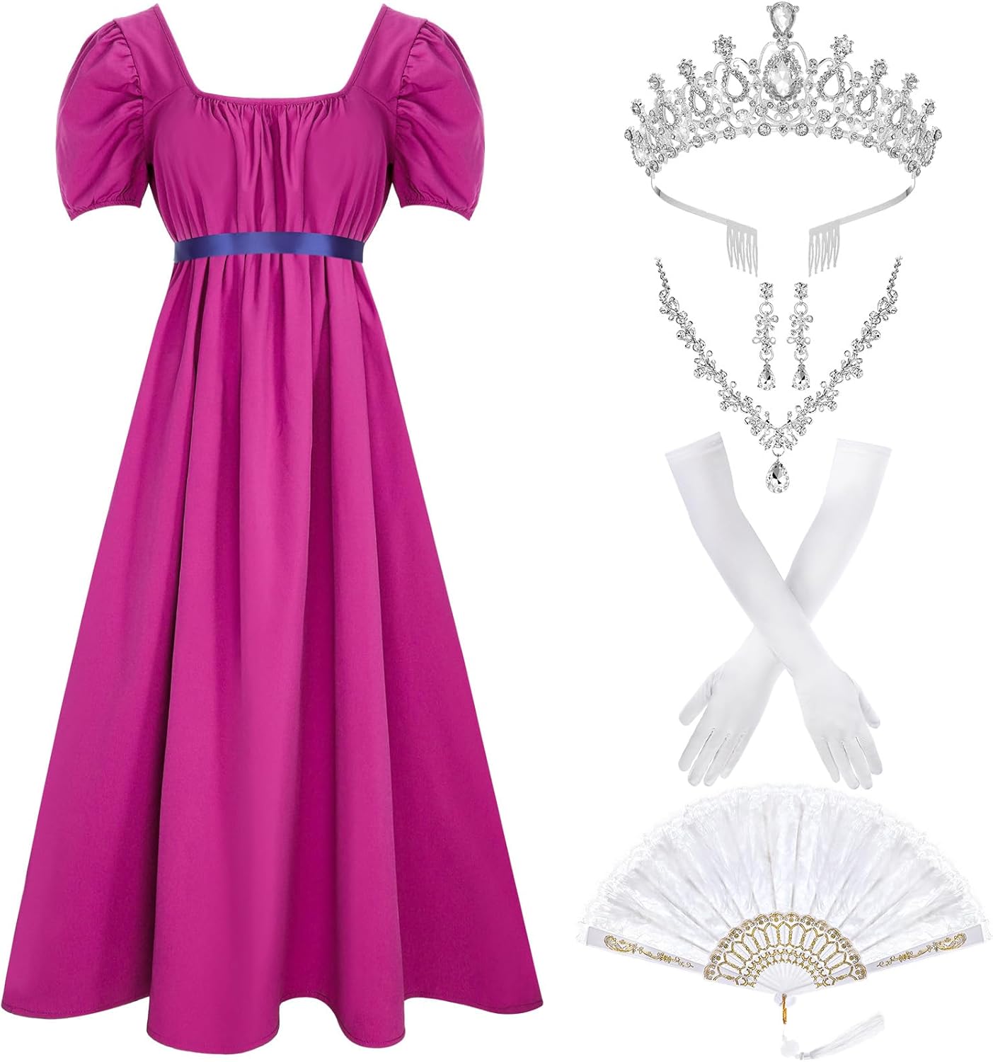 Features: More than just an empire waist gown, this is a quality period piece costume. The manufacture of the dress focuses on delivering a mix of quality, comfort, and style. For a flattering and comfortable experience, this dress can't be beaten. This regency dresses for women with jewelry set is not just a dress but an experience. An ideal gift for Valentine's Day, special days, or birthdays. It will certainly make the receiver feel special and sophisticated in every way possible. This is more than just a gift. It's a joyous moment captured in an elegant package. Specifications: Material: polyester Color: mainly blue, white Size: as pictures shown Package includes: 1 x Regency dress 1 x Rhinestone tiara 1 x Necklace 1 x Feather fan 1 Pair of white satin finger gloves 1 Pair of wedding crystal earrings Notes: Manual measurement, please allow slight errors on size. The color may exist a slight difference due to different screen displays. Our product is not suitable for sensitive skin. Test whether there is any allergy on a small part of your skin before use. Please stop applying if there is any discomfort.