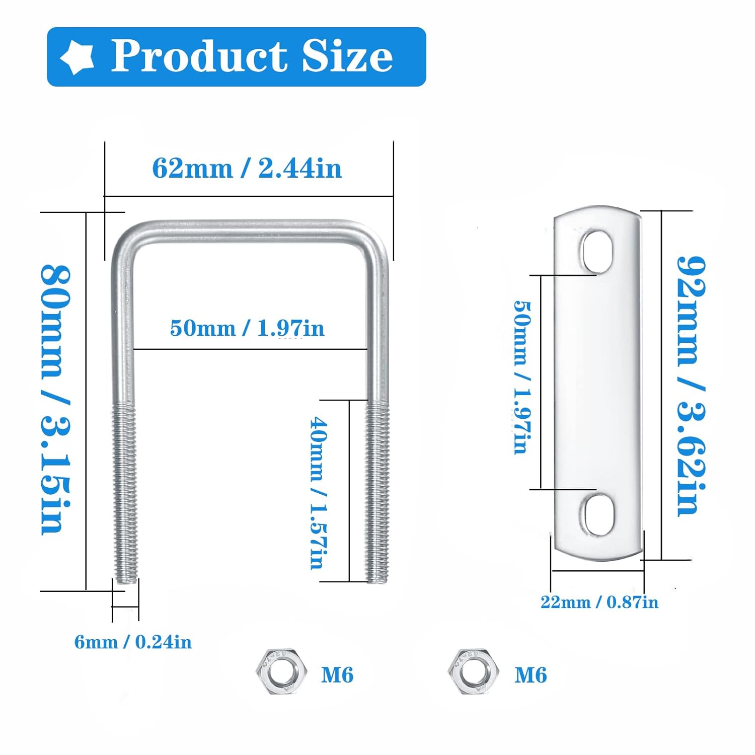 Product Features:1. Durable material: 304 stainless steel with excellent resistance to rust and corrosion, durable for long time use.2. Polished Cut: The square u bolt has been exquisitely cut and polished, the thread of the U-bolt is clear, and the clamping force is improved.3. Wide Range of Applications: M6 stainless steel u bolts can be used in residential, industrial and trailer services, you can use them to fasten or connect locking parts to pipes, wood, etc. Also suitable for boats, pipes and other household items, and industrial applications.4. Complete Accessories: 6 sets of M6 U-bolts are included, which can be installed without tools, which is very convenient to use.Package Includes:6 x Square U-Bolts6 x Spacer Plates.12 x Nuts.Note:1. The object measured by hand will have an error of 1-3mm.2. Due to lighting conditions during filming, there may be slight differences in color