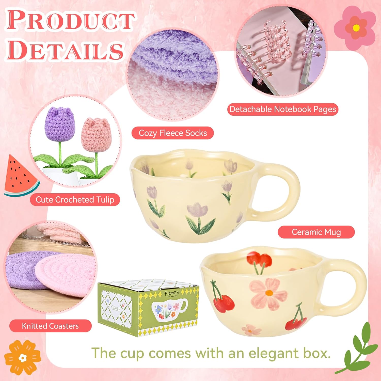 | Included Components | Knitted Cushion, creamic mug, flowers, notebook, socks |