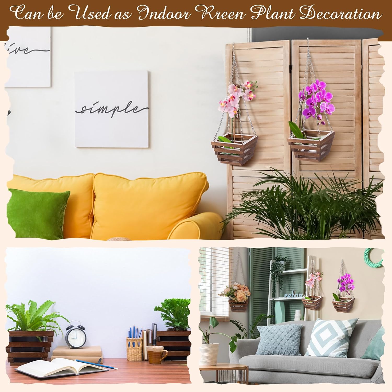 Features: It can be placed indoors or outdoors, can be hung or placed upright. It looks beautiful whether it is hung under the terrace or placed on the table. The wooden hanging planters have space between the wooden slats, which allow for good air circulation and help our plants grow healthily Specifications: Material: wood Color: wooden Size: about 6 x 4 x 4.1 7 inches/15 x 10 x 10.6 cm Package includes: 6 X wooden hanging baskets Notes: Manual measurement, please allow slight errors on size. The color may exist a slight difference due to different screen displays