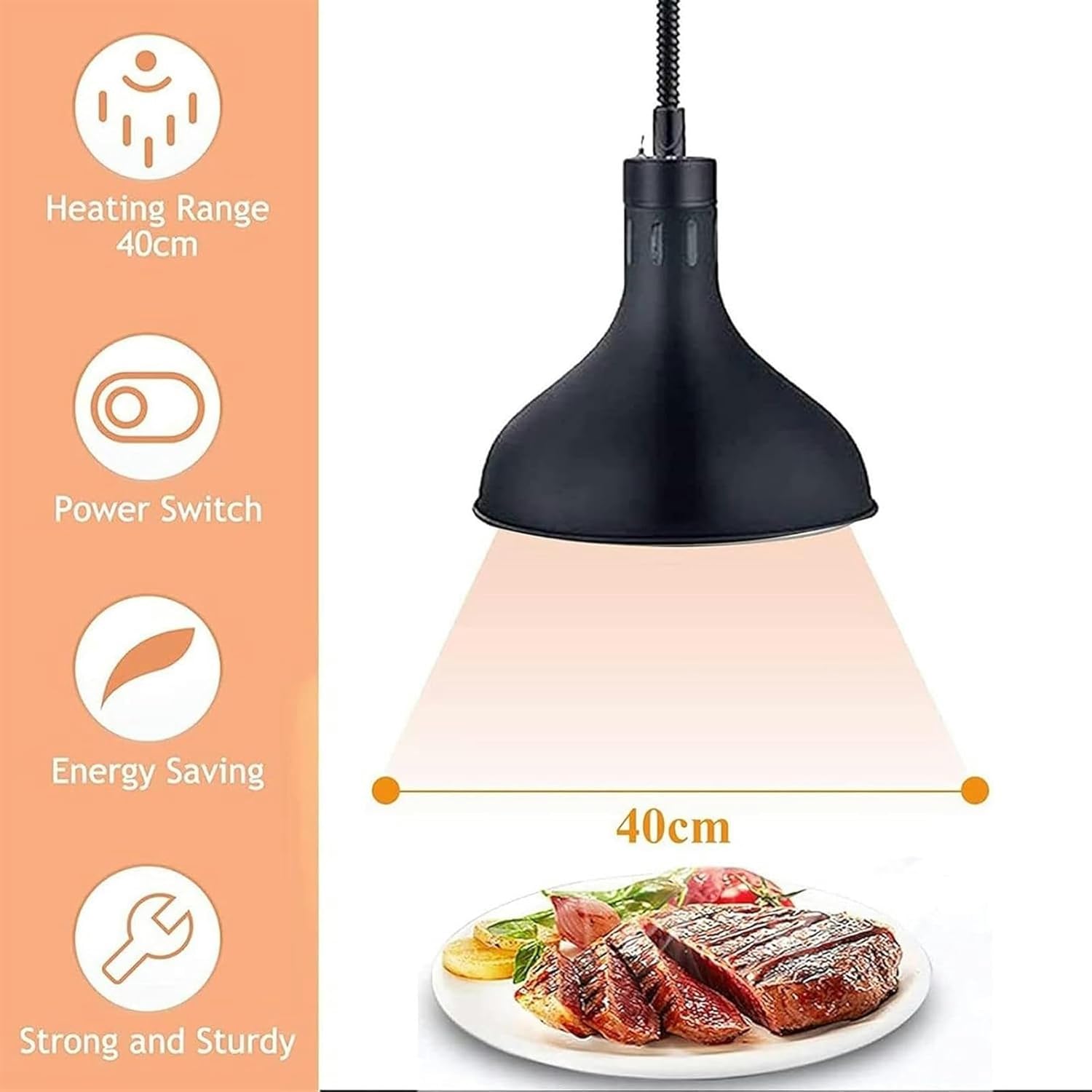 The food heating lamp can keep the dishes warm for a long time. The warm light keeps the color of the food attractive. The heating lamp is the best choice for buffets and hotels! PRODUCT PARAMETERS: Material: stainless steel : Temperature: 30-80 degrees -Wire extension range: 60-180cm Shade diameter: 29 cm Usage: restaurant,hotel,buffet,catering,restaurant,wedding,banquet,cafeteria PACKAGE CONTENTS: food heating lamp NOTE: Please do not touch the lampshade while working.