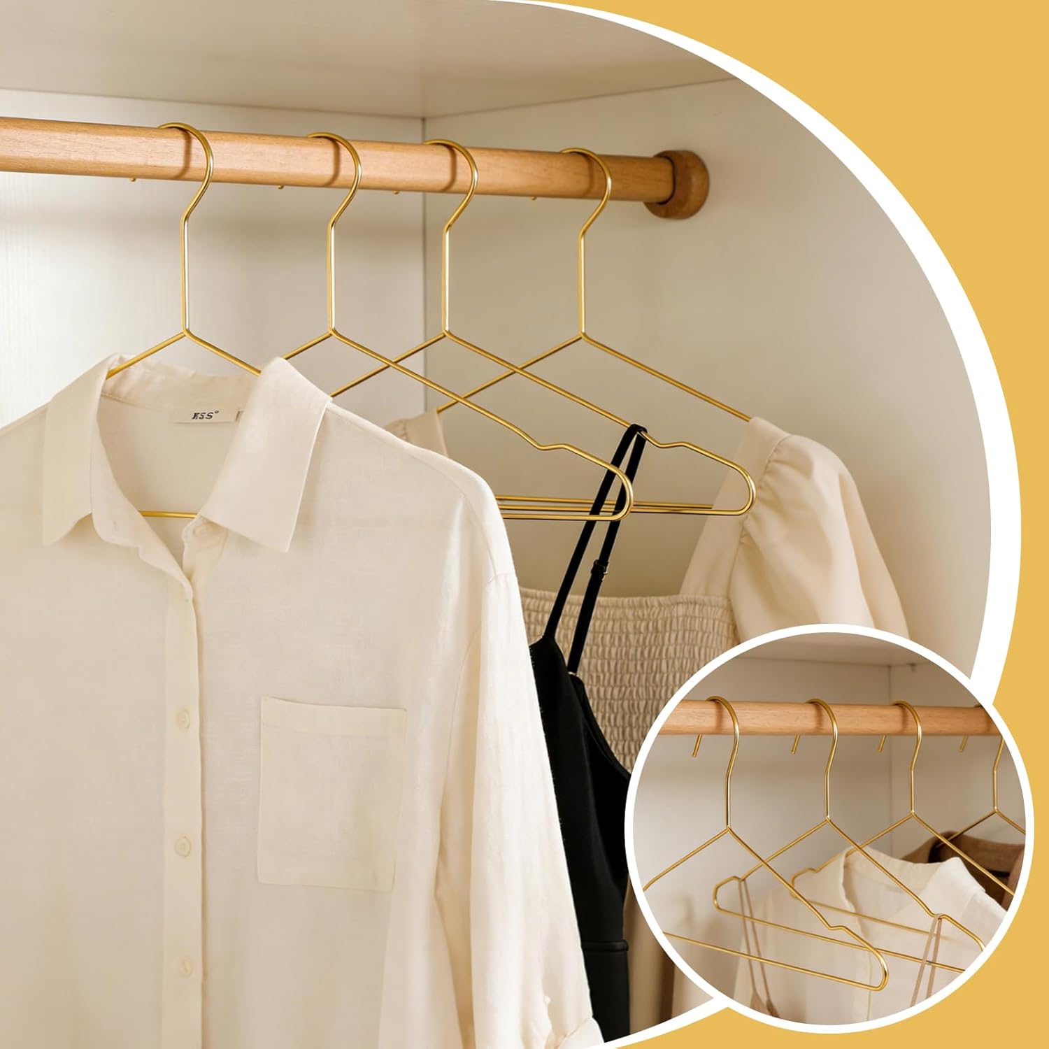 Features: These metal clothes hangers are ideal for organizing your garments. Designed for heavy-duty use, it can hold a wide variety of clothing, including coats, shirts, wedding dresses, and skirts. Its elegant gold finish adds a touch of luxury to your wardrobe, making it perfect for home, dorm, or boutique use. The round hooks make hanging easy, and the non-slip design ensures clothes won't slip off, making it the perfect solution for enhancing the display and storage of your clothes. Specifications: Material: Metal Color: Gold Size: 16.42 x 8.66 x 0.12 inches Package Includes: 60 x Metal Hangers Notes: For manual measurement, please allow slight errors in size. The color may have a slight difference due to different screen displays.