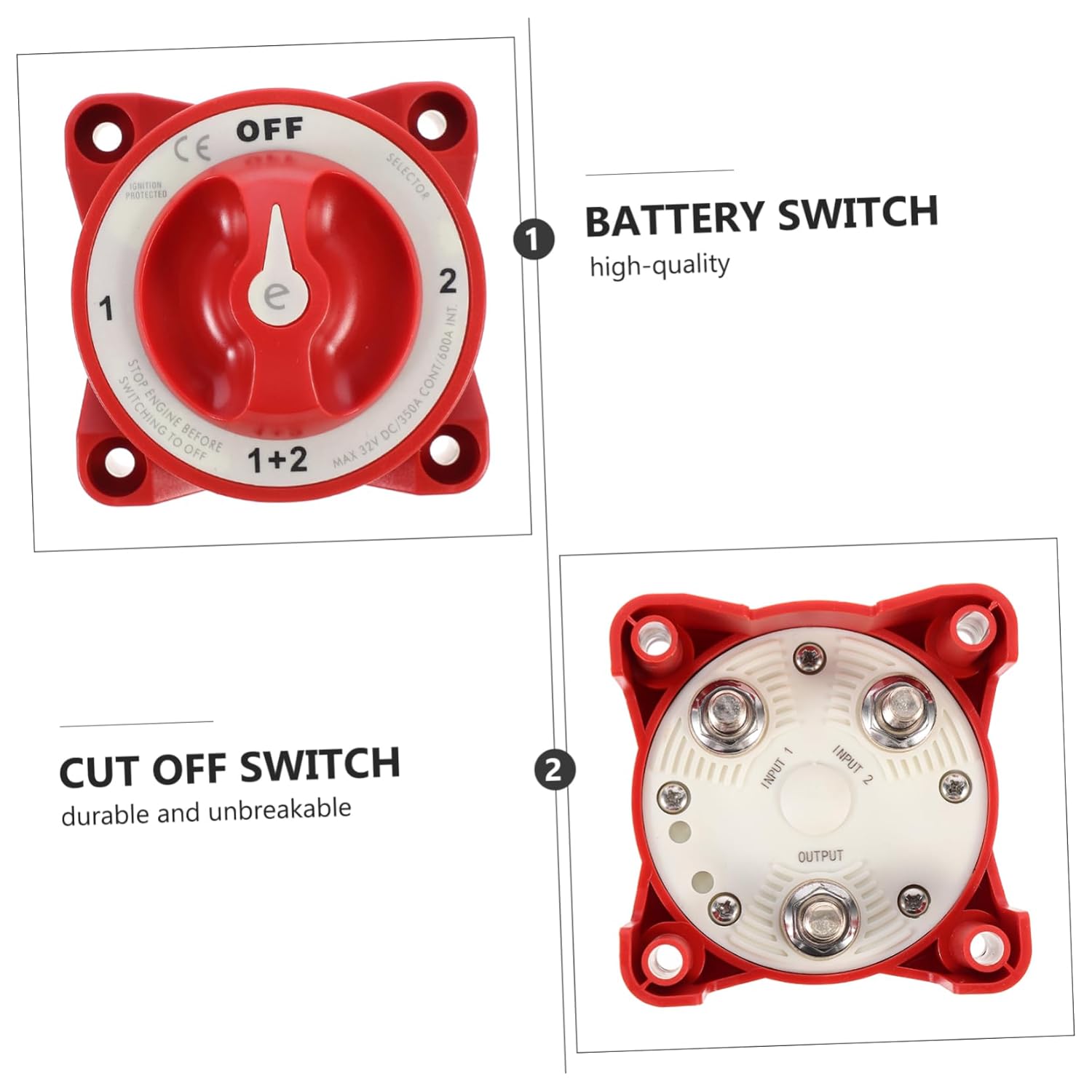 Package Include 1 x Battery Characteristics -Long-term load : 300A Isolator -Wiring screw post: M10 Battery Power -Color: Red Knob. -Size: About 9.80X9.80X8.50cm/ 3.85X3.85X3.34in 600A. -Peak : 500A -Material: Plastic. - It is convenient to install and easy to detach Yacht Power. - Made of plastic material, durable for use Battery Isolator. - for various devices, such as car, yacht, RV, etc Disconnect Power. - Disconnect and reconnect battery by one simple turn of the knob on it Cut Off. - Simple installation, even if a green hand can install it within minutes Battery.Goods DescriptionDisconnect Power Isolate and secure the electrical system.Cut Off Disconnects the battery safely, to any from the battery when vehicle or boat is not in use.Yacht Power , allowing it to be a standalone unit, or linked together with other similar