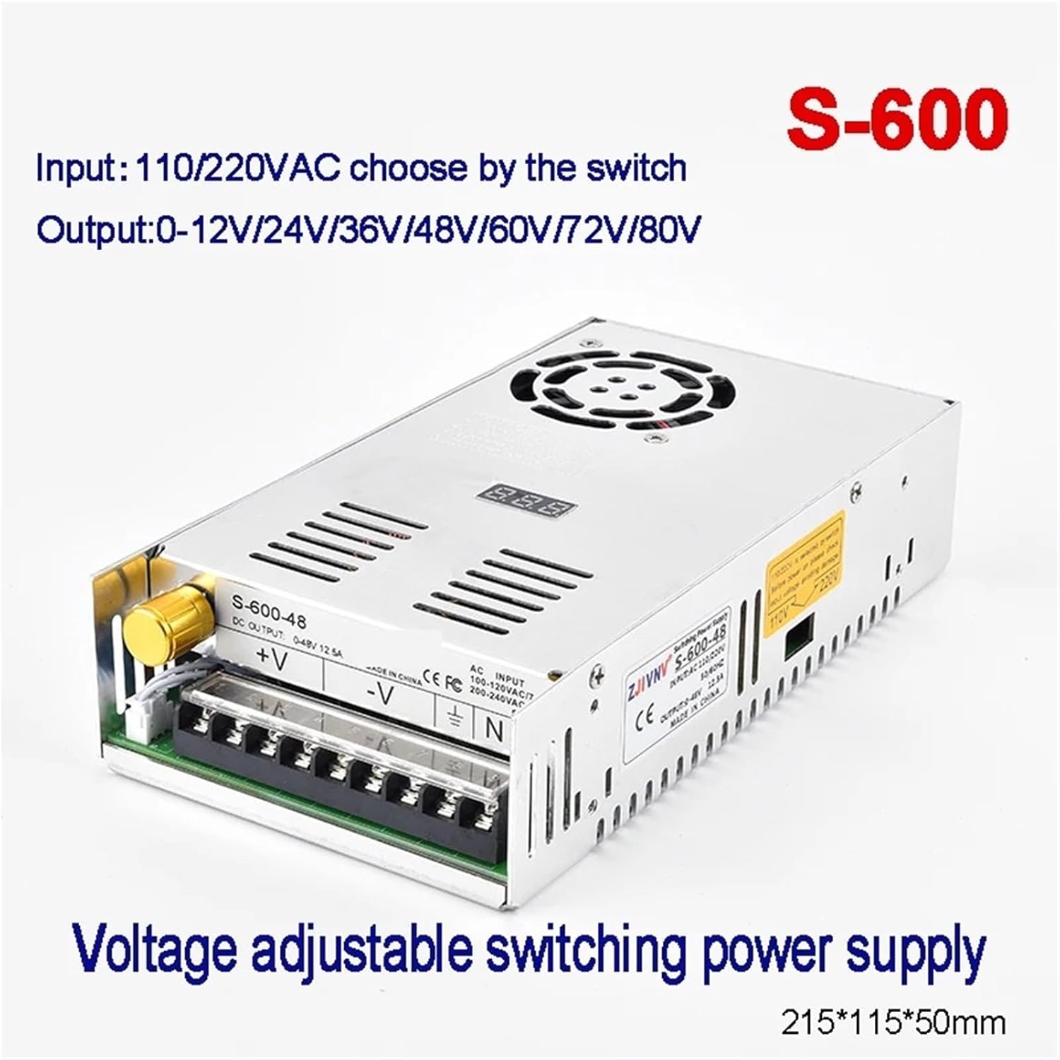 Switching power supplyIs_customized : NoOutput Current : 25AModel Number : S-600Output Frequency : 50/60HZOutput Type : SINGLEproduct size : 215*115*50MM(L*W*H)