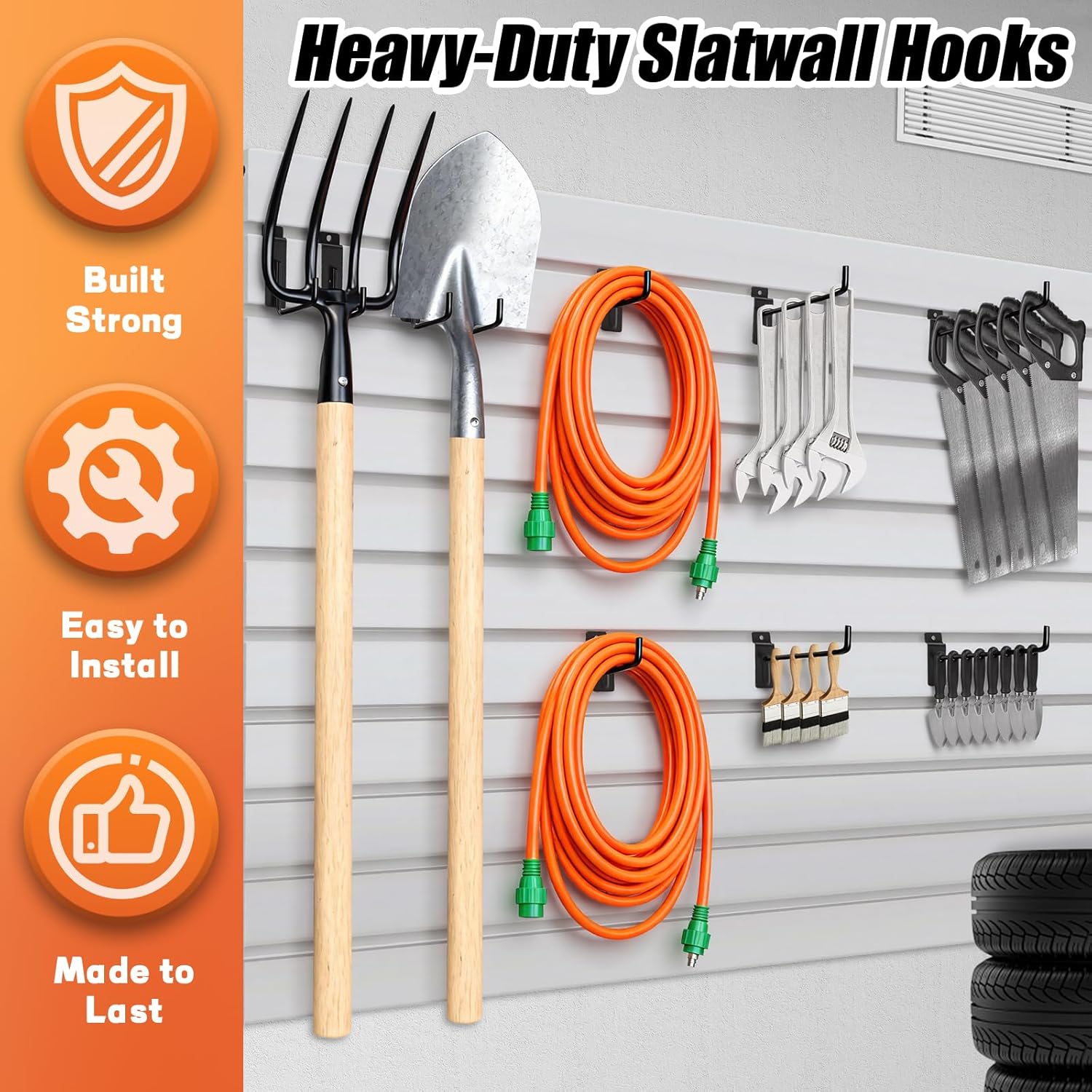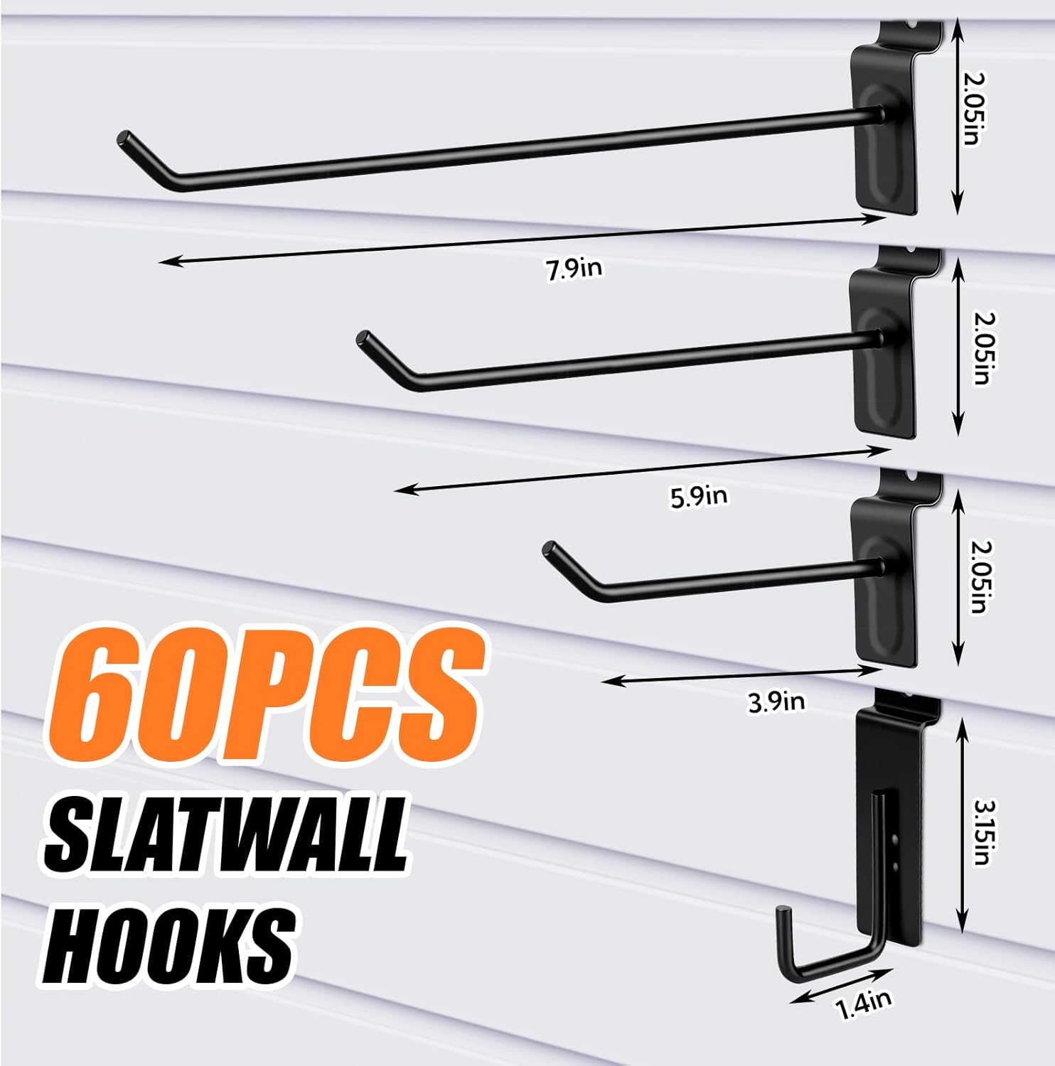 Complete 60PCS Slatwall Hooks Set Includes: 15 x 3.9-inch Slatwall Hooks 15 x 5.9-inch Slatwall Hooks 15 x 7.9-inch Slatwall Hooks 15 x J-Shaped Hooks Safety Upward Design: Each hook features a smart 45-degree upturned end that securely locks items in place, effectively preventing tools, cords, and merchandise from accidentally slipping off. The included J-hooks offer added versatility for specialized hanging needs. This design prioritizes safety and stability for your belongings. Durable & Heavy-Duty Material: Constructed from high-quality steel with a robust rust-resistant black powder coating, these hooks are built for long-term, heavy-duty use. They are designed to withstand significant weight without bending or deforming, ensuring reliable performance in garages, shops, and other demanding environments. Universal Compatibility & Tool-Free Installation: Designed for universal compatibility with any standard slatwall (pegboard) groove. Installation is instant and hassle-free—simply snap the hooks securely into place. No screws, tools, or experience required, making it an ideal organizing solution for both DIY beginners and professionals. Wide Application: 1. Garage & Workshop: Perfect for organizing hand tools, power tool accessories, cleaning supplies, extension cords, and sporting goods, transforming cluttered spaces into models of efficiency. 2. Retail & Warehouse: Ideal for stores and warehouses to display merchandise, hang products, and organize inventory neatly and accessibly. 3. Home & Shed: A practical solution for managing gardening tools, bicycle gear, and other household items in basements, sheds, or closets.