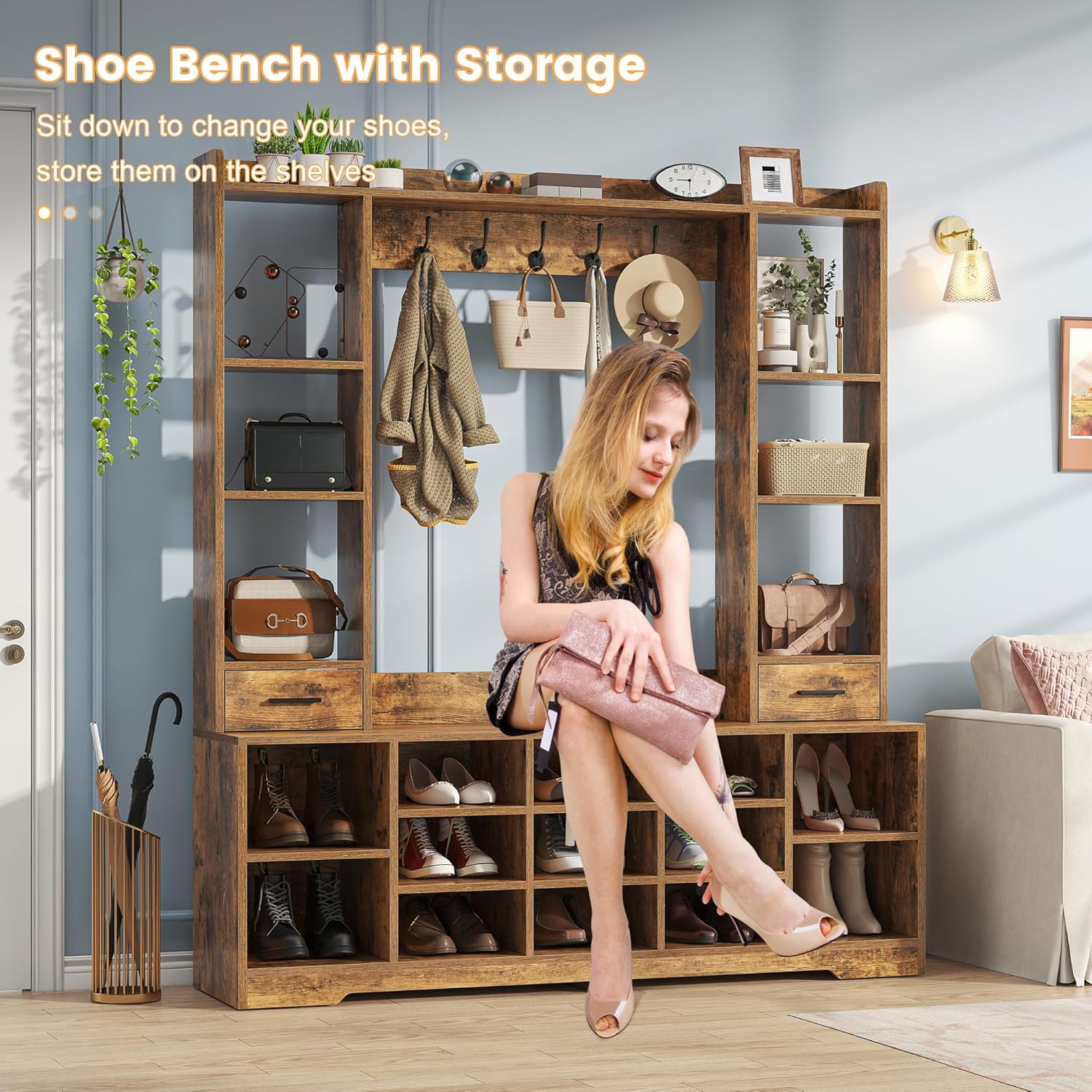 • Ample Storage Space: This hall tree for entryway with storage has plenty of storage space. Featuring top and side storage shelves, 2 drawers, adjustable storage shelves, 5 metal hooks, shoes bench and 13 Shoe Cubbies. Available in different heights for high-top shoes and storage boxes. Keep your entryway organized