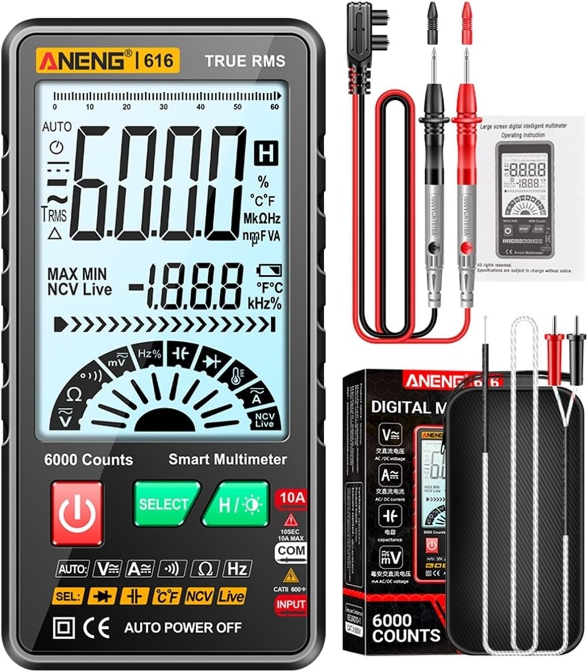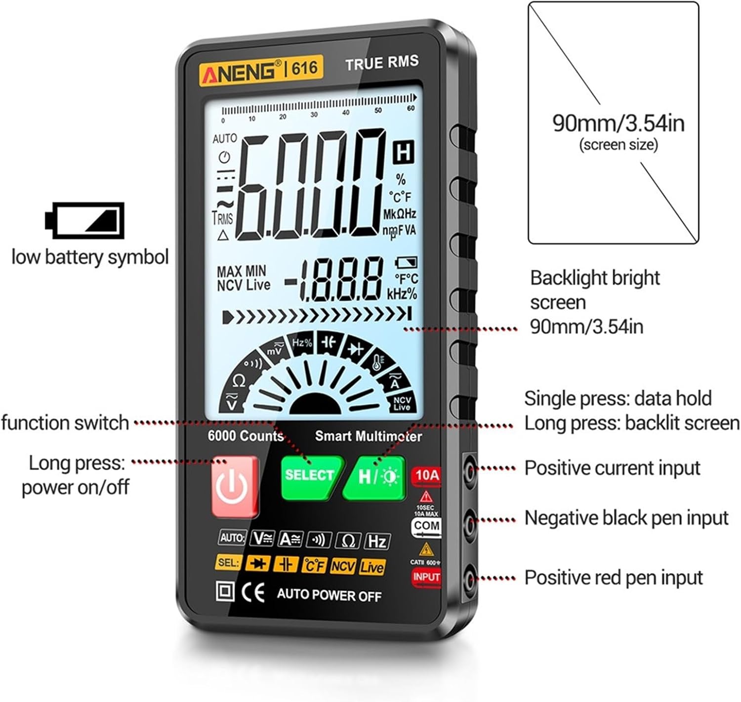 Multimeters & Analyzers616 Large Screen Backlight MultímeterDescription:This product is a battery-powered, auto-ranging, true RMS digital multimeter with a 6000 counts LCD display.616is a 6000 count pocket type true effective value automatic scanning digital meter.616automatically recognizes and measures according to the different input voltage/current/resistance/etc. signals.616has the characteristics of stable performance, high precision and clear reading.616also has additional convenient functions of flashlight test.616is an ideal tool and instrument suitable for factories, teaching and electronic enthusiasts.Features:FunctionRangeResolutionAccuracyAC voltage0~600V0.1mV~1V±(1.5%+8d)DC voltage0~600V0.1mV~1V±(1.2%+5d)AC current0~10A0.1mA~10mA±(2.5%+8d)DC current0~10A0.1mA~10mA±(2.2%+8d)Capacitance6nF~60mF1pF~10F±(10%+8d)Resistance0~60M0.1~10k±(1.5%+10d)Temperature0~4001 +-(1.0%+3D)32~71+-(1.2%+10D)Hz0~10MHz±(4.0%+10d)NCV inductionLive Zero FireDiode/On/OffflashlightReal-time tempdata retentionbattery modelAAA*2bright screenproduct materialABSwire materialPVC/Brassmax display6000 countstotal wire length100cm/39.37inAuto shut-downAfter 10 minutes of inactivityNet Weight105g(without battery)Product Size137.4*68.4*14.5mm/5.4*2.7*0.57inPacking List:1 * Digital Multimeter1 * Test leads1 * Manual1 * Packing box==========Is Smart Device : noOperating Mode : AutoMeasuring Capacitance Range : 6nF~60mFOperating Temperature : 0 - 40 DIY Supplies : ELECTRICALMeasuring Resistance Range : 0Ohm~60MOhmModel Number : 616 Digital Mini MultimeterMeasurin