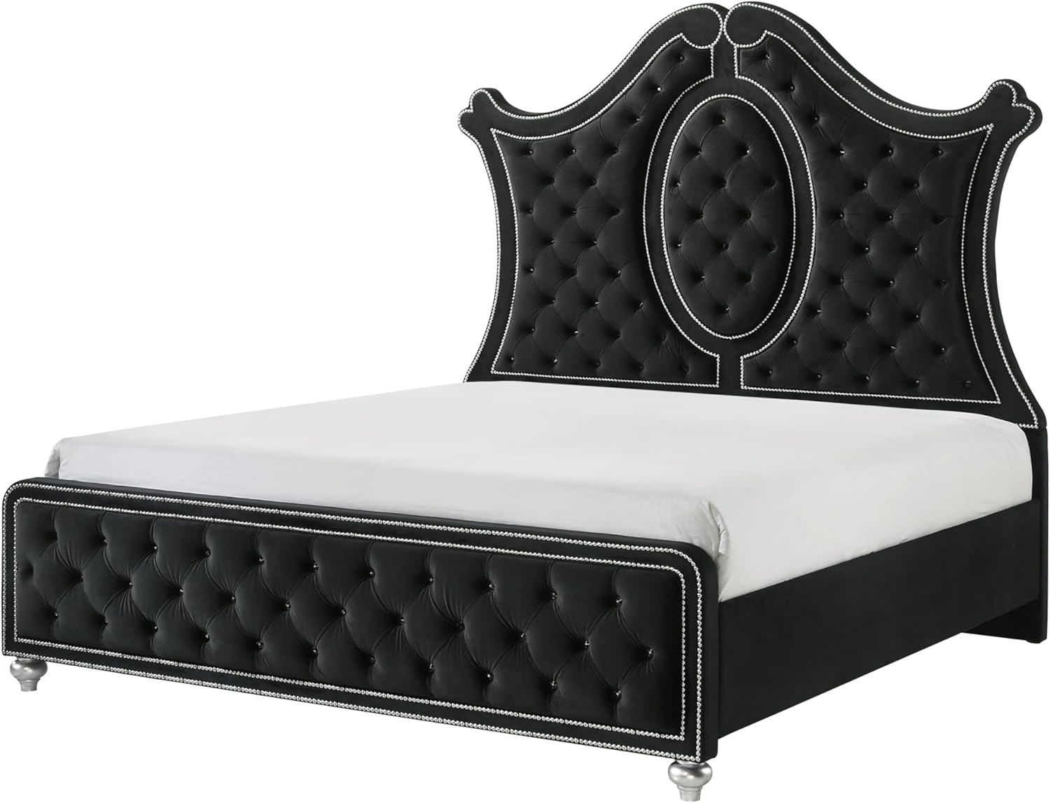 Product Features: Traditional Style Black Finish Button Tufted Bed Crystal Accents 8mm Tempered Glass on Nightstand and Dresser Crystal Accents Jewelry Tray Strong and Durable Product Dimensions: King Size Bed : 88.75" X 79.3" X 76.6" H Dresser: 60.25" X 16.13" X 38.5" H Mirror: 39.4" X 1.2" X 40" H Chest : 40.5" X 16.13" X 49.13" H Nightstand : 25.9" X 16.13" X 26.75" H Product Description: Indulge in timeless elegance and dramatic sophistication with this stunning bedroom collection, designed to make a bold statement. The centerpiece features an exquisitely tufted headboard with luxurious upholstery and intricate nailhead trim, exuding opulence and grandeur. Coordinating pieces showcase diamond-patterned tufted accents, mirrored details, and polished hardware, blending classic design with modern glamour. With ample storage and impeccable craftsmanship, this ensemble offers both style and practicality, creating a lavish retreat that embodies refined comfort and striking aesthetics. Perfect for those seeking a bedroom that radiates luxury and charm. Listing Include: 6pc Bedroom Set(Bed, Dresser, Mirror, Chest and 2x Nightstand)Only. Mattress : Not Included Simple Assembly Require. Include curb side delivery with free lift gate service, NOTE : No inside home delivery.