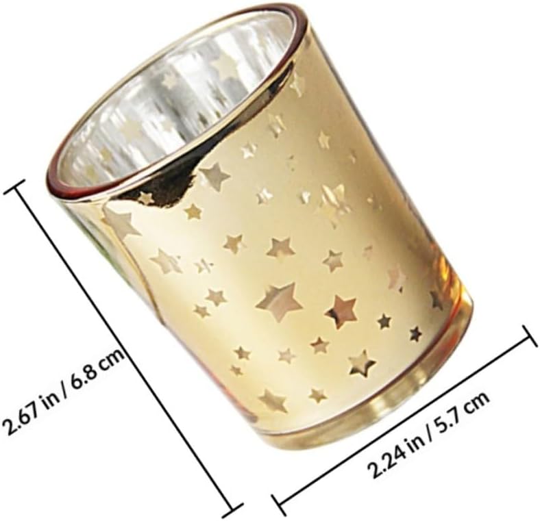 Package List 6 x candle cups Characteristics -Size: About 5.70X5.70X6.80cm/2.24X2.24X2.67in -Material: Glass -Product Info:Star Candlestick -Color: Golden - appearance and design, creative and fashionable candleholder decor Dining Table Candlestick. -Made of good glass material for use, our hollow candle cup won't break easily. -Features the hollowed patterns and European style structure, which is full of the sense of beauty Candlestick Decor. -Use it to celebrate the festival and create a romantic atmosphere for your place Candle Cup. -Wild range of application. It is especially suitable for the home decor, scene layout Household Hollow Candle Cup.Goods DescriptionTable Candle Cup Made of good material and fine craftsmanship, sturdy and for long-term use.Candlelight Dinner Supply Featuring simple, stylish, elegant and beautiful, create a warm atmosphere for your home.Candlestick Decor This item is a glass hollow candleholder.Home Decor Designed with fine and elegant appearance, goes well with any style of home decoration