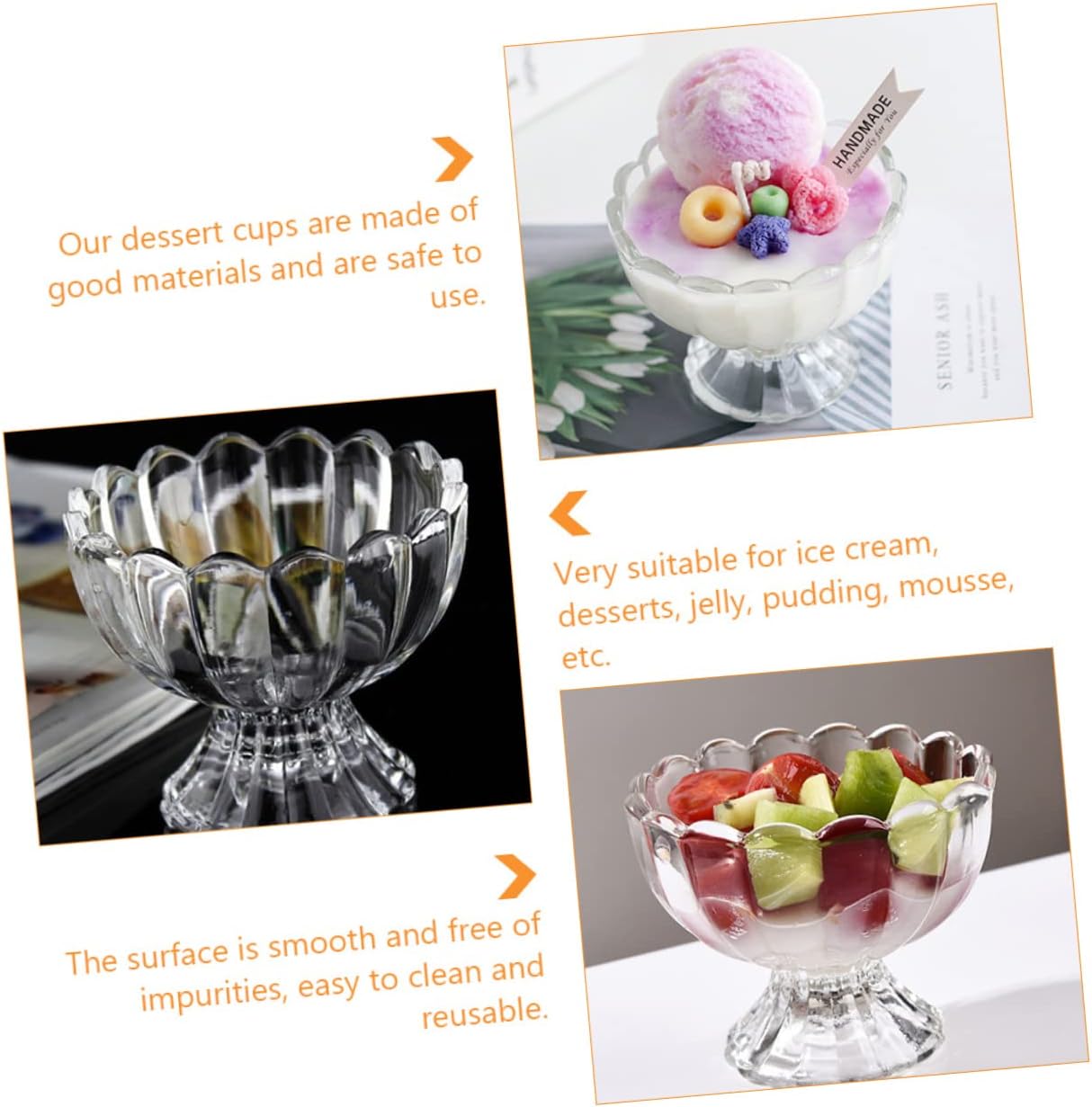 Package Include 6 x Cups Features -Size: About 9.00X9.00X7.50cm/ 3.54X3.54X2.95in small desert cups. -Material: Glass Yogurt Cups. -Color: Transparent ice cream bowl. -Capacity: 100ml Dessert Container. - The design is simple, but they are very practical to use, giving you a good experience cups ice cream bowls. - Small and three-dimensional, one-piece , beautiful and practical clear fruit bowl. - ice cream, desserts, jelly, pudding, mousse, etc small dessert bowls. - The surface is smooth and free of impurities, easy to clean and reusable small cups for dessert. - Our dessert cups are made of good materials and are safe to use cups for desserts.Goods Informationfooted ice cream bowl These pudding cups are made of materials, glass material, cold and heat resistant, safe and healthy, and very safe to use.ice cream serving cup They are holding jelly, dessert, ice cream, mousse, pudding, etc