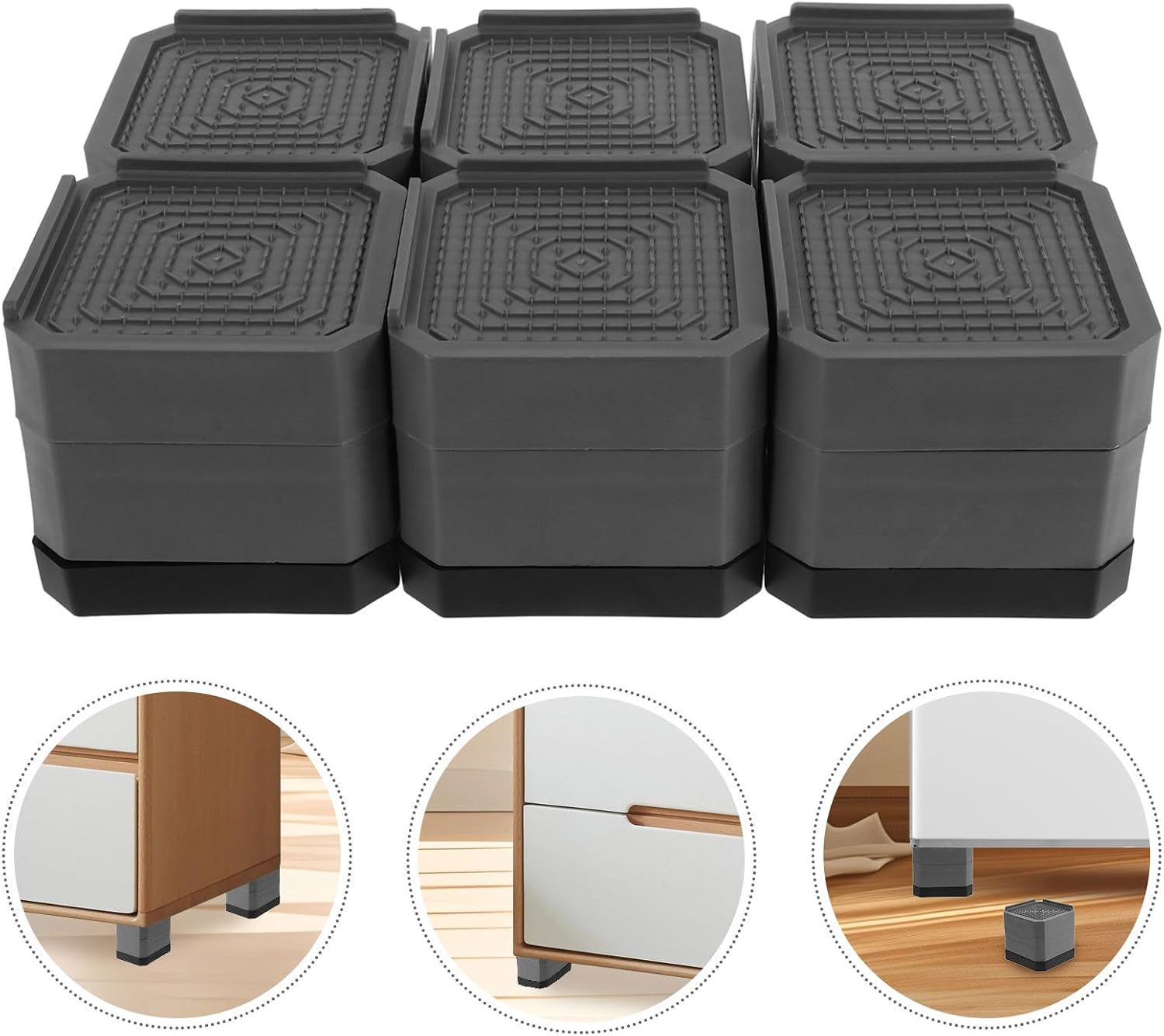 Package Include 6 x bases for furniture feet Features -Product Info:Anti-slip mute pad -Wide compatibility: for use with tables, chairs, coffee tables, refrigerators, and washing machines, these pads protect both your floors and furniture washer dryer small floor mats -Noise minimization: the pads are designed to significantly cut down on noise from furniture movement, contributing to a quieter home washer and dryer mat -Nonslip functionality: these pads are crafted from sturdy plastic to prevent furniture from moving, enhancing safety and stability in your living space foot pedal washing machine - Size: 8.40X8.40X7.90cm/3.30X3.30X3.10in -Height adjustment: the raised design of these pads makes it easier to clean and maintain the space beneath your furniture, cleanliness furniture leg risers - Color: Grey -Material:Plastic -Effective shock absorption: the plastic material offers excellent shock absorption, reducing friction and potential damage to your floors and furnitureGoods Descriptioncabinet riser Enhance the stability and height of your tables, chairs, and other furniture with our square furniture leg risers.base for washing machine This will help protect your floors and provide a more comfortable living space.washer and dryer mat These pads are made from durable plastic and are designed to reduce noise and vibrations.washer and dryer pedestals They are easy to install; simply lift each leg of your furniture and place a riser underneath