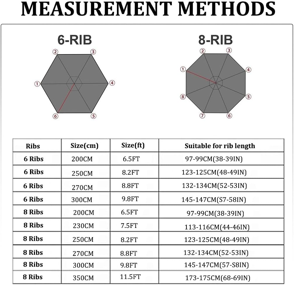 ? This replacement parasol cover is made of high - density polyester. It has great water resistance and UV protection for outdoor use. ? The Market Table Umbrella Canopy has reinforced stress points where the ribs meet the fabric. This makes it strong and more robust. ? Note: The package contains only the patio umbrella canopy. The umbrella ribs pole and finial are not included. This allows you to customize the replacement canopy using your existing umbrella framework. ? It's great for personal shade at home and in the garden. You can also easily at campsites beaches play areas pergolas greenhouses markets etc. It suits wooden steel or aluminium umbrella frames. ? Specifications: - Available in diameters of 200CM (6.5FT) 250CM (8.2FT) 270CM (8.8FT) 300CM (9.8FT) 230CM (7.5FT) 350CM (11.5FT) - Types: 6 - arm and 8 - arm options for different umbrellas ? Functions: Sunshade waterproof UV protection easy to clean and disassemble.