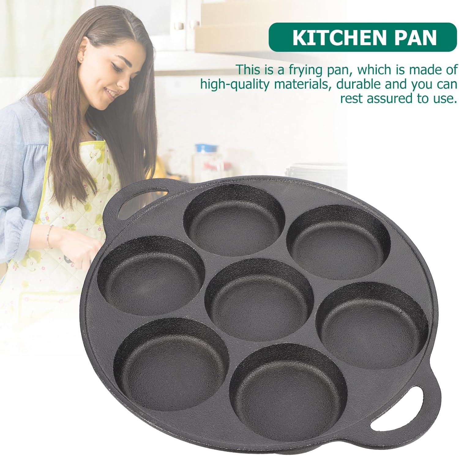 Package List 1 x pan Features - Size: About 26.00X26.00X2.50cm/ 10.22X10.22X0.98inch Casting Iron Pan. -Color: Black Iron Frying Pan. - Material: Iron Egg Frying Pans. - A nice and necessary kitchen cooking tool that you should not miss Kitchen Accessory. - Adopts of iron material, its high durability and practicality Fried Egg Pan. - for cooking many of food, such as snails or omelette Kitchen Cookware. - for home kitchen, hotel, restaurant, western food store and more Snail Cooking Pan. - Smooth surface, fine workmanship. , high performance but Non Stick Egg Pans.Goods DescriptionEgg Frying Pans This seven hole nonstick frying pan can make kinds of delicious dishes, fried egg, pancake, snail, oyster and so on.Snail Cooking Pan The non-slip comfort grip is designed for manipulating ease during cooking.Snail Oyste Pan Make breakfast easier and quicker