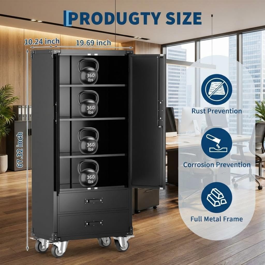 This 71" heavy-duty steel file cabinet offers modular storage with 3 adjustable shelves, 2 lockable drawers, and 1 lockable door (fits Letter/Legal/A4 files/tools), plus 4 swivel braking casters for mobility. Built with 1.2mm cold-rolled steel (80kg shelf capacity, rust-proof), its tall design maximizes space (equiv. 3 standard cabinets) for home/garage use. Tool-free assembly in 30 mins—secure, durable, and space-efficient.