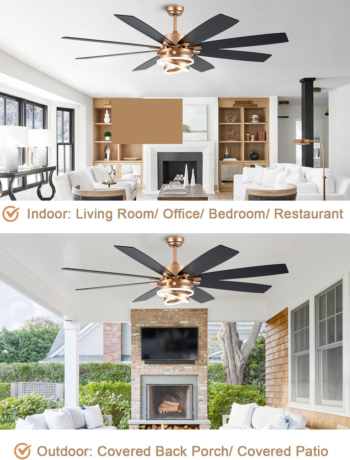 • Dual Blades, Bold Contrast: 8 Dual blades in sleek black and wood grain blend modern and natural vibes; Paired with gold adjustable lampshades, this 72 inch ceiling fan with lights turns your ceiling into a design highlight, fitting large spaces like open-concept living rooms, high-ceilinged bedrooms, and covered patio