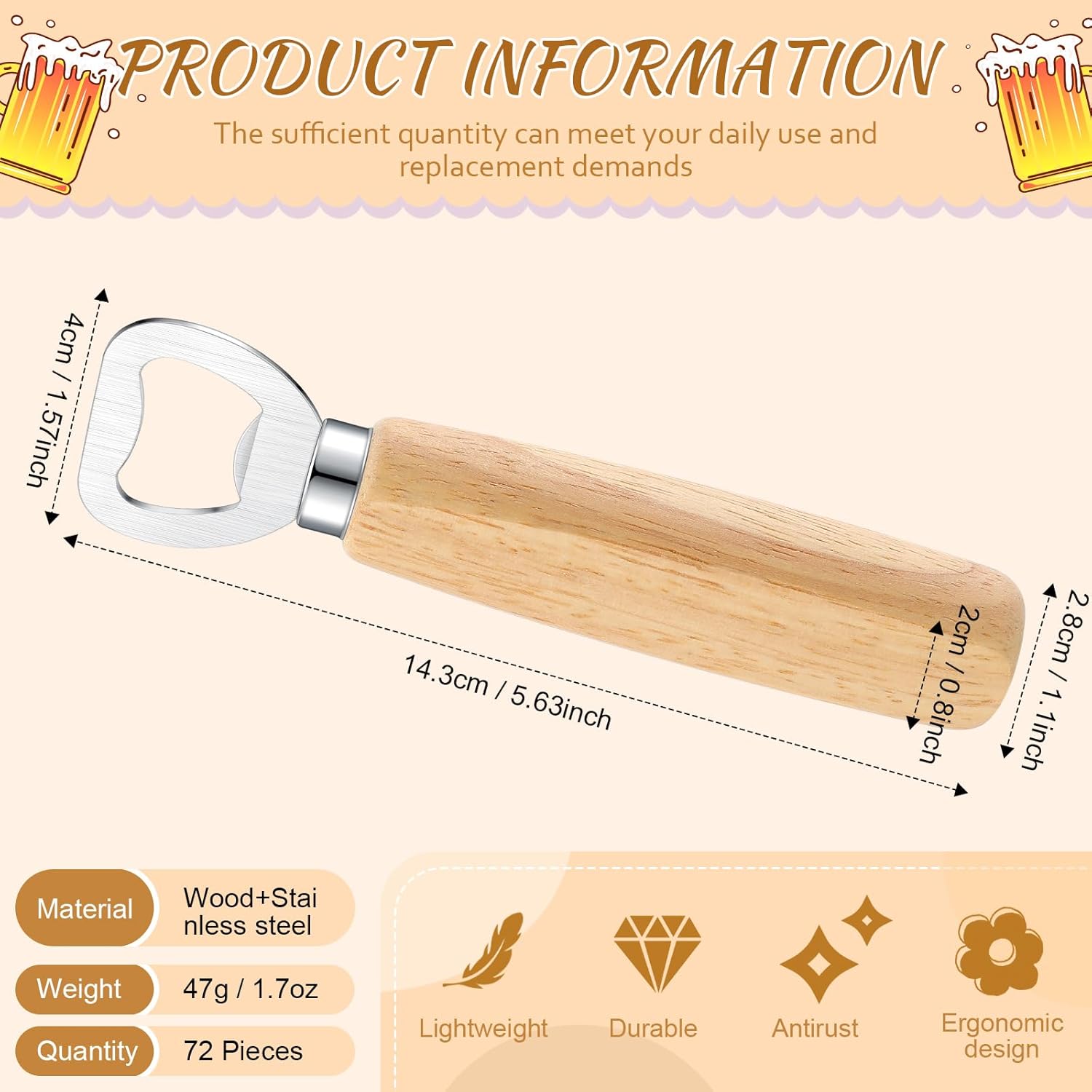 Features: This beer opener for bartender is versatile for various types of bottles, such as beer, soda, juice, soft drinks and more, bringing lots of conveniences and allowing you to enjoy drinks at any time. The bartender beer opener can be widely applied for various occasions, such as home, kitchen, restaurant, bar, party, canteen, etc., which will be a practical and useful tool for you. Specifications: Material: wood and stainless steelColor: as the pictures shown Size: about 14.3 x 2.8 cm/ 5.63 x 1.1 inchesWeight: about 46.4 gPackage includes: 72 x Bartender beer openerNotes: Manual measurement, please allow slight errors on size. The color may exist a slight difference due to different screen displays.