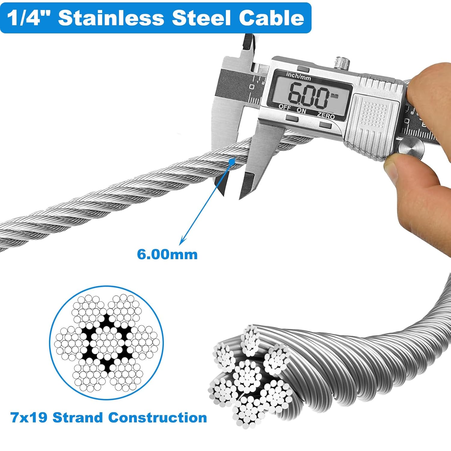 • STEEL CABLE KIT: 1pcs 75ft galvanized cable, 4pcs M6 wire rope clamp, 4pcs M6 wire thimble, (1/4" thickness) heavy duty wire rope with loops. Most accessory you need is included, and our kit is designed with simplicity in mind, allowing you to take charge of your project.