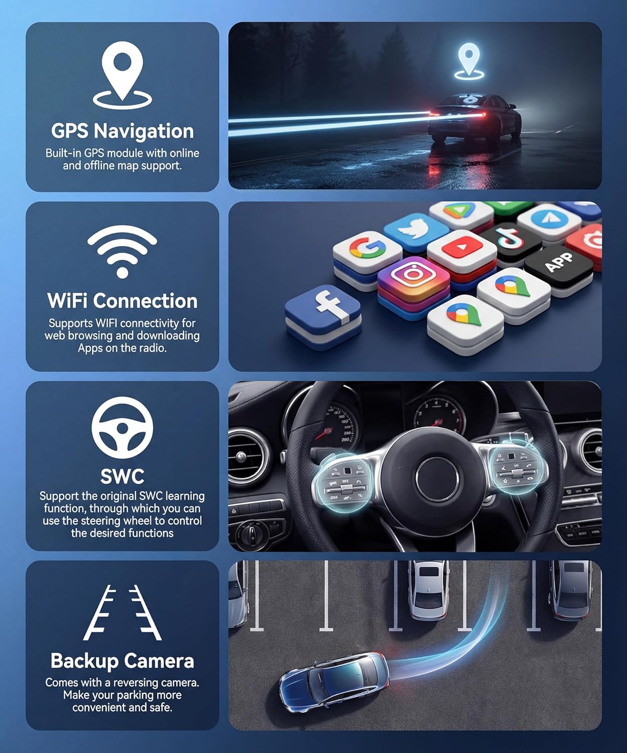| Additional Features | 1280*720P IPS Touch Screen, 5G Wifi/GPS Navigation, 8 Core 4G RAM+64G ROM, Bluetooth 5.0/32EQ, Wireless Carplay Android Auto |