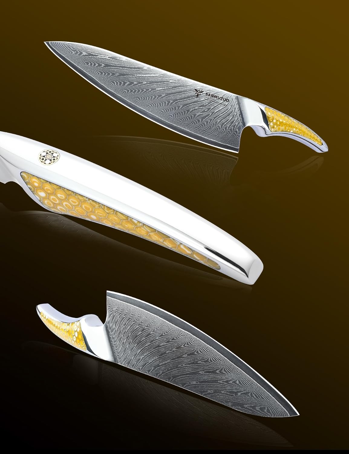 • Unique and Fashion Design: Our knives have a unique appearance design, with clear Damascus steel veins on the blade. They are made through hundreds of processes, and every surface of the knife is mirror-polished. Finally, hand sharpened 15° blade angle make thinner cuts, accomplishing a variety of difficult tasks in the kitchen with more precision
