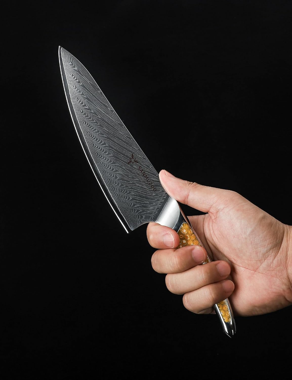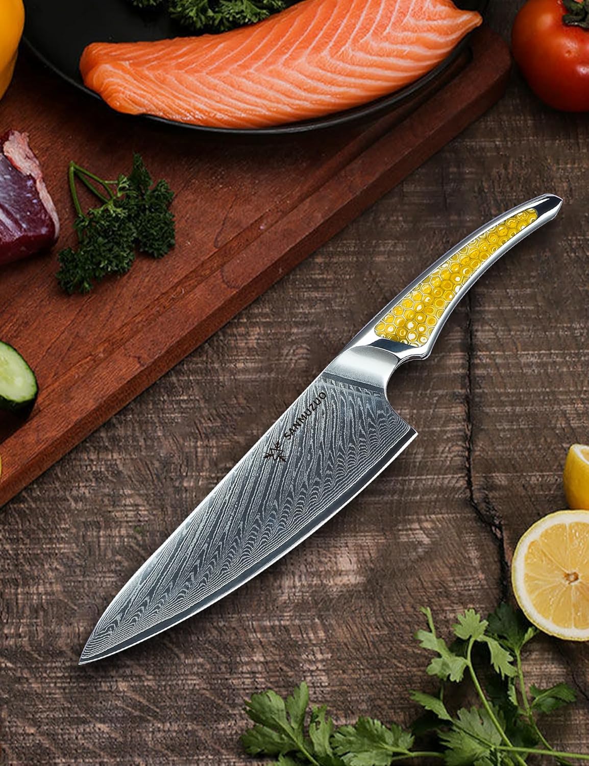 8 inch Chef Knife, Japanese VG-10 Damascus Steel Kitchen Knife, Ultra Sharp Cooking Knife with Full-tang Handle in Yellow Resin, LA-S9 Series
