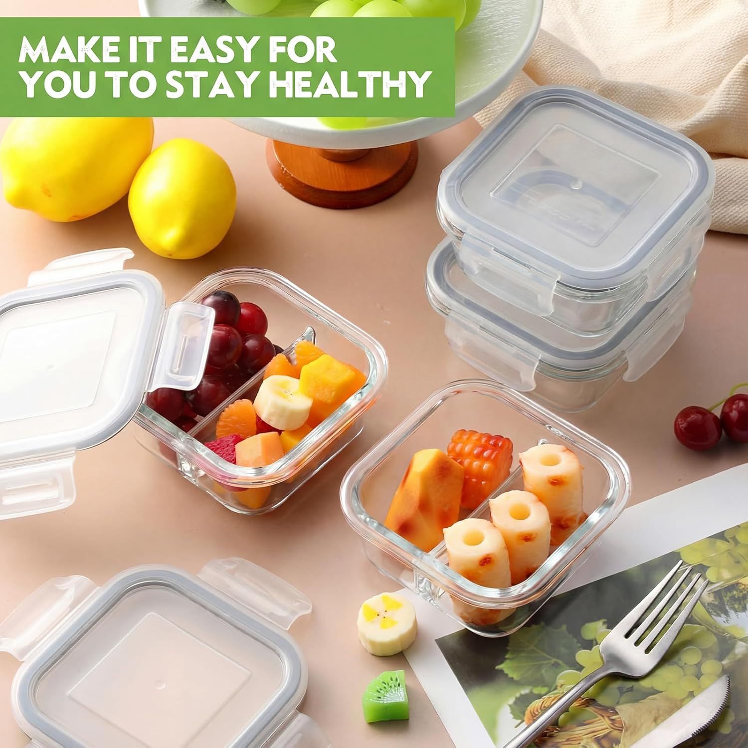 Features: Our glass food storage containers open easily and are dishwasher safe. Portable and lightweight: The thoughtfully designed portion-controlled bowls are easy to carry, saving space and fitting into a handbag. Perfect for picnics or travel, they simplify meal prep and make staying healthy a breeze. Specifications: Material: high borosilicate glass, BPA-free glass Color: clear Size: 4.5 x 4.5 x 2 Inches Package includes: 8 x Glass bowl Notes: Manual measurement, please allow slight errors on size. The color may exist a slight difference due to different screen displays