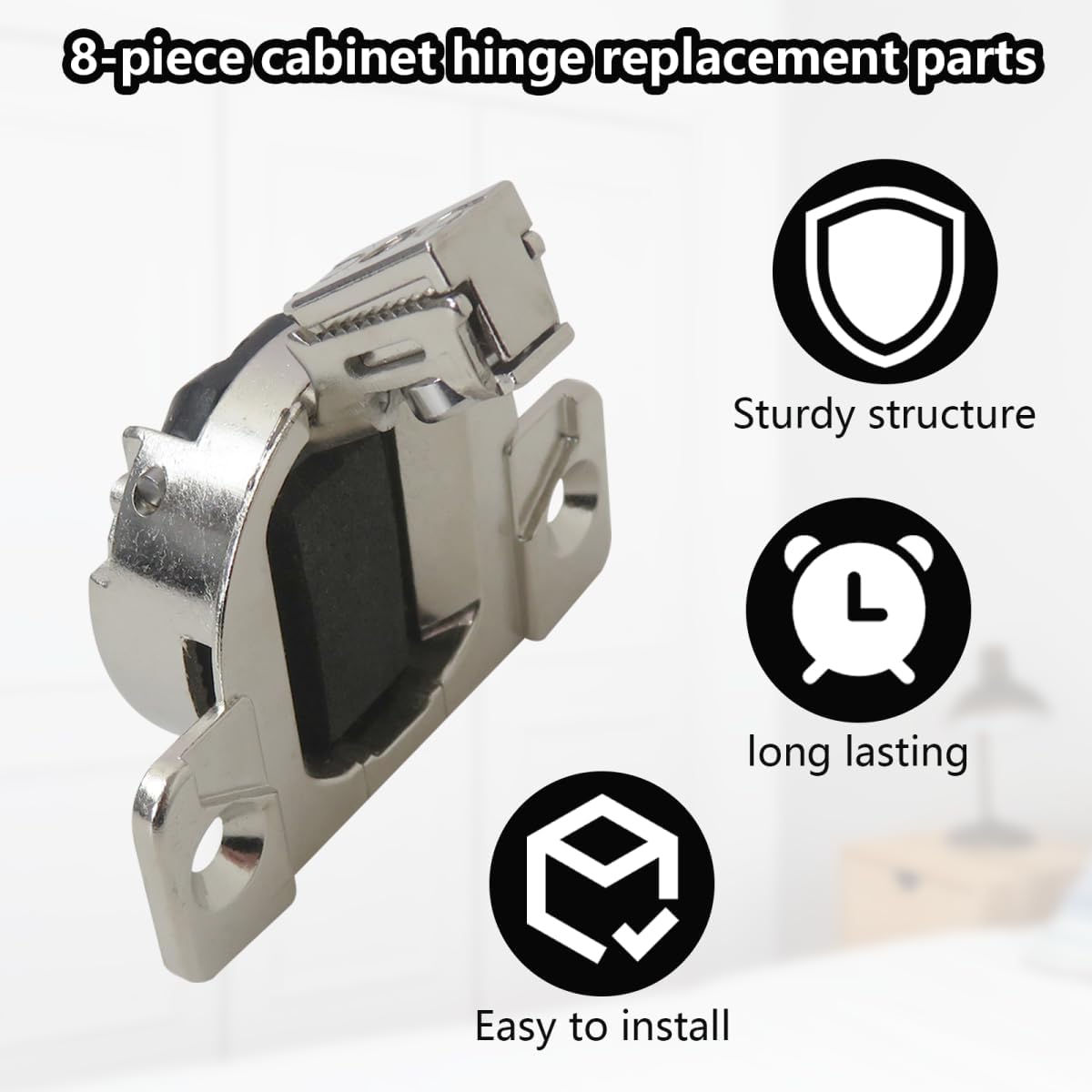 Icelily 8 PCS Replacement for Blum 30.310-11.02 Cabinet Hinges, 110 & 120 Degree Screw On Self Closing, 33.3600 Compact 31 & 33 Hinge(Mounting Plate Not Included) ▷Core Information: ·Opening Angle: 110 degrees. ·Finish: Nickel-plated, providing a rich metallic luster that is wear-resistant, maintaining a clean and attractive appearance over time. ·Quantity: 8 hinges per pack ▷Easy Installation: Installation is quick and straightforward. You only need a screwdriver to attach the new hinge to your existing mounting plate, allowing you to complete the repair in minutes.