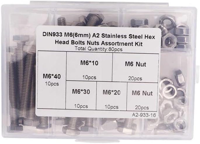 80Pcs M6 Hex Screw Nut Set Stainless Steel Corrosion Rust Proof M6 Hex Screw and Nut Kit for Industrial Furniture Features:1. 80 Pieces Set: The set contains 40pcs M6 screws and 40pcs M6 nuts, the screw specifications are M6x10 M6x20 M6x30 M6x40, 10pcs for each specification.2. Stainless Steel Material: The screws and nuts are made of 304 stainless steel, which is corrosion, oxidation and rust resistant, no oil, easy to clean and maintain.3. Professional and Standard: The screws have uniform pitch, clear thread, no residual burr, good grip can be obtained by fixing the thread.4. With Storage Box: The kit comes with a storage box, which can classify and store screws of different specifications and nuts, and is easy to carry.5. Wide Applications: The screws and nuts kit is suitable for industrial, machinery, furniture, cars and motorcycles and DIY.Specifications:Item Type: M6 Hex Screw Nut SetMaterial: 304 Stainless SteelSpecifications: M6Package List:10 x M6x10 Screw10 x M6x20 Screw10 x M6x30 Screw10 x M6x40 Screw40 x M6 Nut1 x Storage Box3. We confirmed order addresses. Your order address MUST MATCH your address.4. The images shown are not the actual item and are for your reference .5. SERVICE is provided by the carrier and excludes weekends and holidays. s may vary, particularly during the holiday season.7. Due to stock status and time differences, we will choose to your item from our first available warehouse for .8. We seller are not in charge of import , buyer is responsible for that. Any dispute caused by this is unreasonable.9. BR buyer please provide the cpf or cnpj, it will be better for you to get it more quickly. thanks and Item specifics:Is customized: Ye