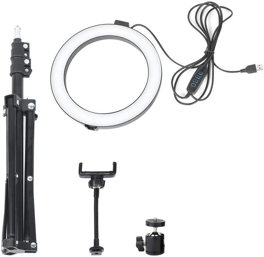 Specification: Material: Carbon Steel + Metal Threaded Pipe + Abs Colour: as shown in the picture. Brightness Adjustment: Three Lighting Adjustment Bead Type: Smd 2835 Led Bead Type: Smd 2835 Led Quantity of Lamp Beads: 80Pcs Luminous Flux: 1600-2000LM Colour temperature: 2900-5600 K. Colour Display Index Ra/Cri: 95 Luminous Angle: 120 Degree Working Power Supply: DC 5V Power: 10W Power Supply: USB Power Supply. Light colour: white light, warm light, warm white light. Ring Light Size: 8 inch Tripod Height: 1.2M/47.24 inch Power Cable Length: 200 Cm/78.74 inch Packing List: 1 x ring light. 1 x small ball head. 1 x soft tube phone clip. 1 x tripod