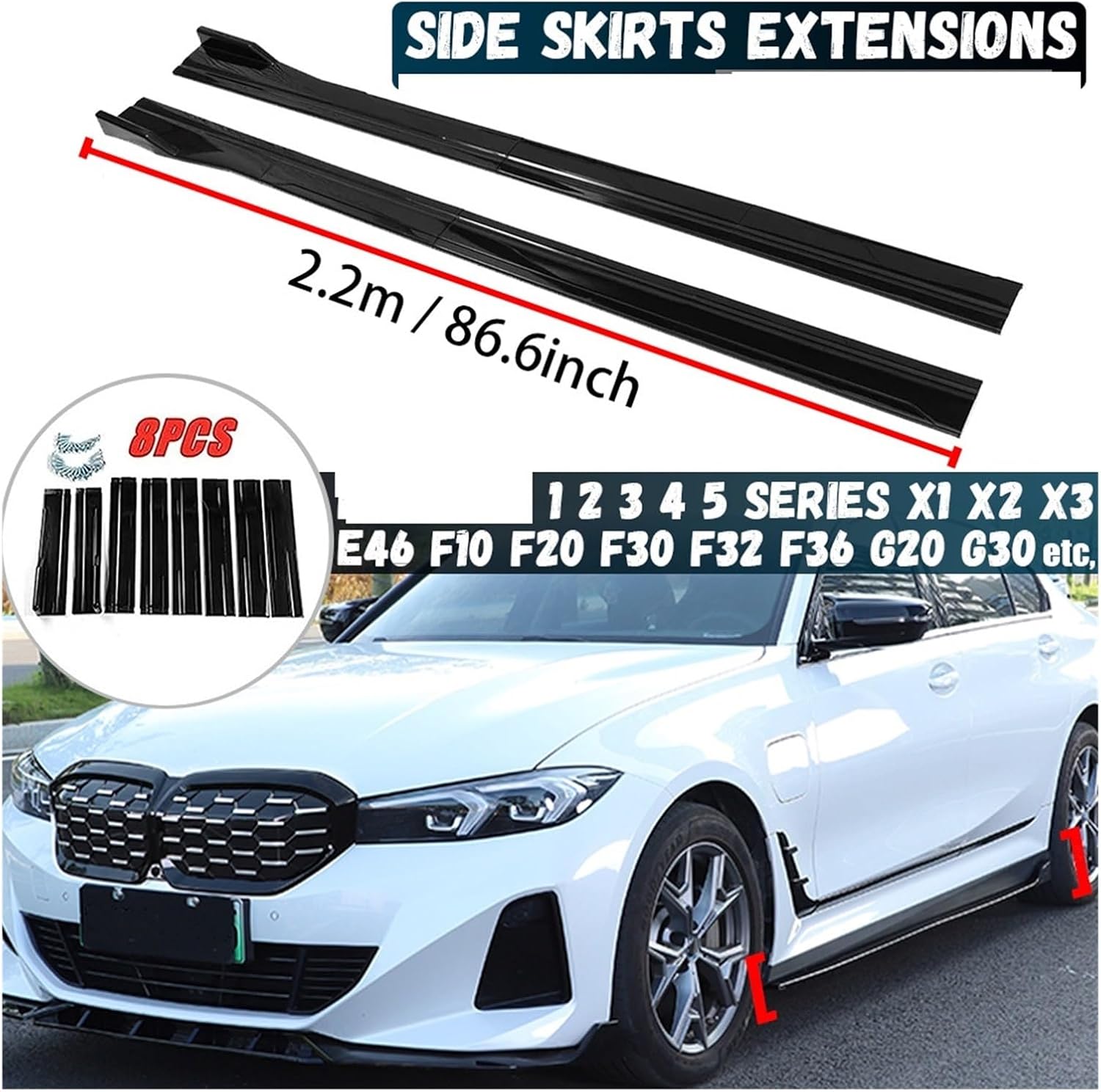 8PCS 2.2-meter side skirt extended rocker panel lip separation bumper, compatible with BMW 1 2 3 4 5 series E46 E90 F10 F20 F21 F30 G20 G30Accessories:Attention: Make sure the length is the size you want!!!standard-Type: Side Skirt Extension-Material: Polypropylene PP-Color: Bright Black/Black and Red-Length dimension: 2.2m/86.6 inchesNote:-Due to manual measurement, please allow for a difference of 1-3cm.-Due to differences in display and lighting, images may not reflect the actual color of the item.Thanks for your understanding.-Please confirm that your vehicle matches the parts compatibility table.-Please measure the length of your vehicle before purchasingPackage already includes1 pair of 2.2-meter side skirt extensionsInstall screws==========Product weight: 1.8kgItem height: 10cmItem width: 20cmItem length: 50cmProject Type: BumperDear buyer:Please confirm the information before shipping your order.Packaging includes: (such as product model, quantity of product information in customer orders)We are a store with guaranteed quality and can solve all your problems.Wishing you a pleasant shopping experience!!!