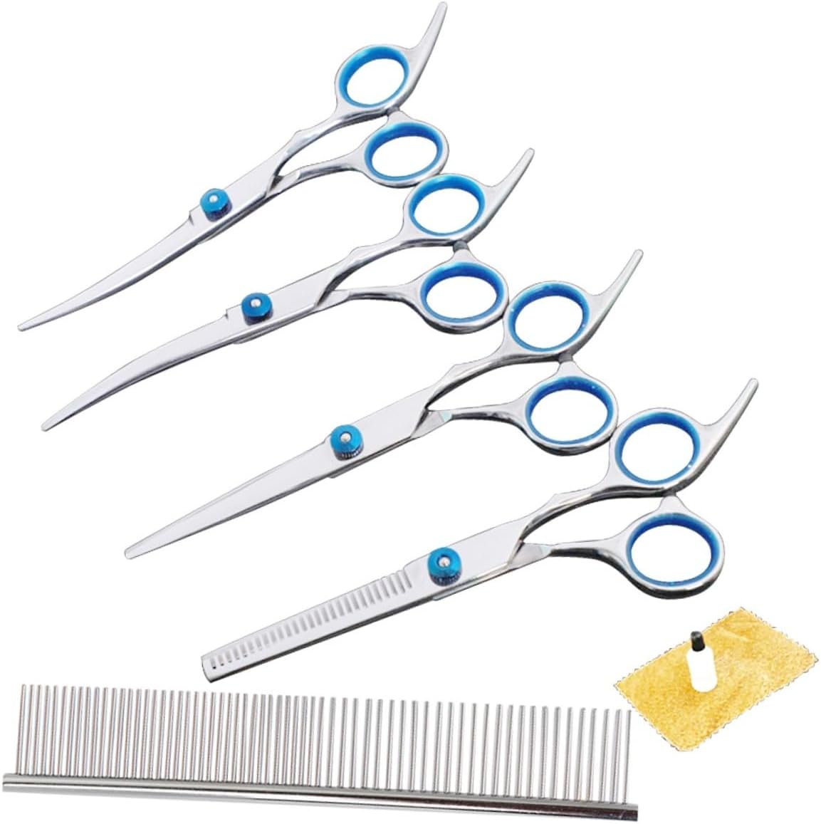 Package List 8pcs of One Set x Pet Hair Scissors Characteristics - Color: Blue Hair Cutter for Pet. - Material : Stainless steel. - Packing Size: About 20 x 15 cm - Professional hair shears scissor, for barber salon or home daily use Pet Hairdressing Scissors. - Made of premium stainless steel, the scissor is and hard to rust Teeth Cut Scissor. - Light weight and portable, easy to carry and storage Dog Hair Styling Tools. - The scissors are very sharp, not easy to stuck and damage hair Dog Barber Scissor. - Applicable for families, pets dog and cat salon use.Goods DescriptionPet Hairdressing Scissors people are prefer to cut their bangs or hair end by themselves.Teeth Cut Scissor If you are one of them, This barber teeth cut scissor will be best .Dog Barber Scissor It's tool for own and you lovely pet hairstyling use.Hair Cutter for Pet The scissor is made of stainless steel, which is durable enough for lasting use