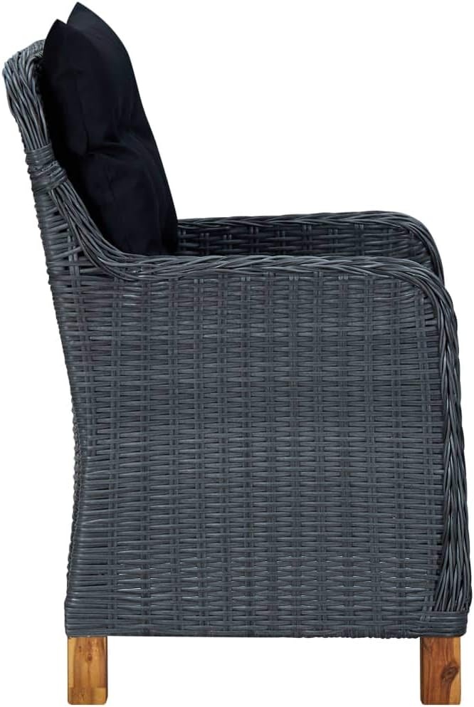 This patio dining set is a perfect combination of style and functionality and meant to be the focal point of your garden, balcony or patio.The furniture set is made of lightweight and low-maintenance round PE rattan, making it perfect for outdoor use, easy to clean with a damp cloth. Thanks to the powder-coated steel frame, the armchairs and table are stable and durable. The solid tabletop is perfect for placing or displaying your various essentials. The thickly padded cushions add extra comfort in your lounging time. The cushion cover is equipped with a zip, removable and washable. Additionally, the solid acacia wood legs add to chairs' sturdiness and stableness. This furniture set is easy to move with the lightweight construction.Note: We recommend covering the set in the rain, snow or frost.Poly rattan color: Dark grayCushion color: BlackMaterial: Round PE rattan, powder-coated steel, solid acacia wood, tempered glassMaterial of cushion: 100% Polyester cover with foam fillingDimensions of chair: 24.4" x 25.6" x 36.2" (W x D x H)Dimensions of table: 78.7" x 39.4" x 29.1" (W x D x H)Seat width: 21.3"Seat depth: 19.3"Seat height from the ground: 16.1"Armrest height from the ground: 25.2"Seat cushion thickness: 2.4"Back cushion thickness: 3.9"Glass thickness: 0.2"Assembly required: YesDelivery contains:8 x Chair8 x Seat cushion8 x Back cushion1 x Table