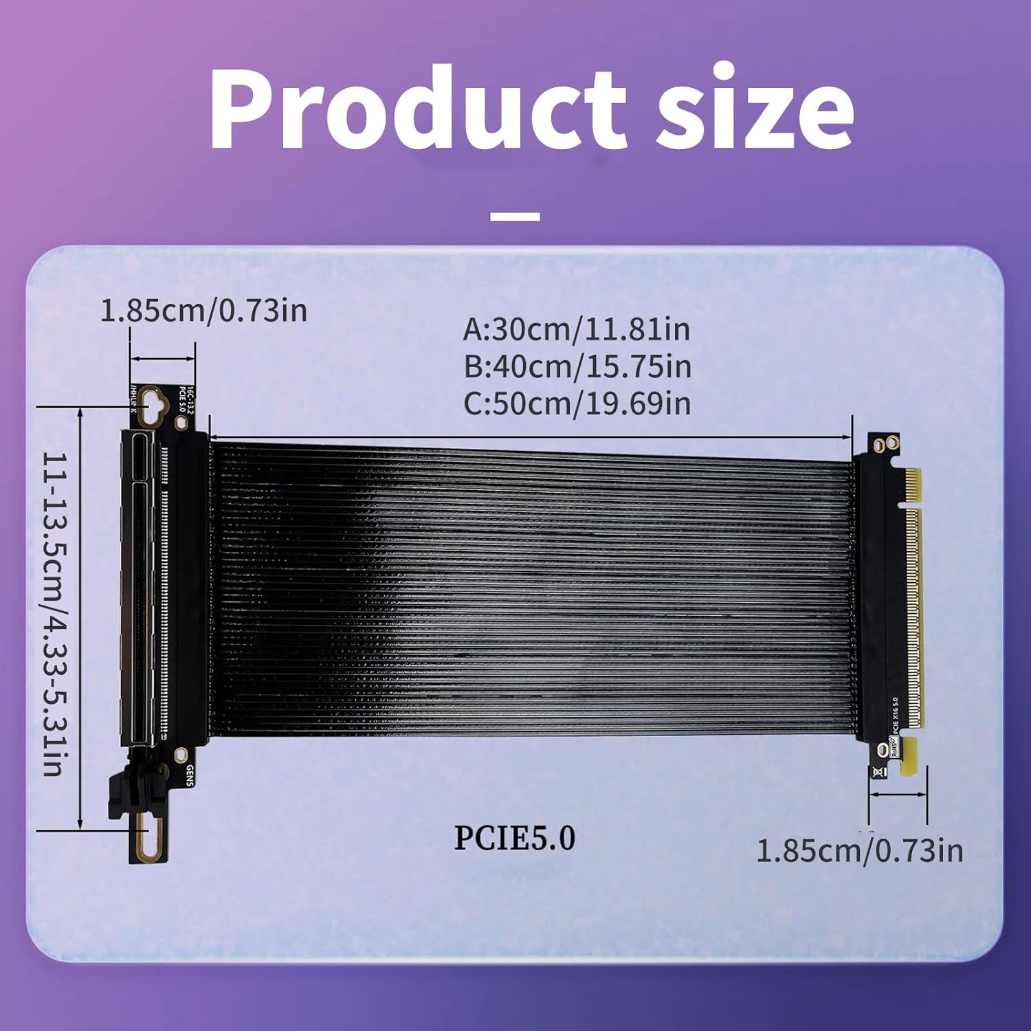 90 Degree Right Angled PCIe 5.0 X16 Risers Cable Vertical Graphics Card Mount Aluminum Foils Shielded Thin Flat DesignFeatures:blazings fast data transfer with PCIe 5.0 X16 extension cable, featurings 90 degree right angled for GPU vertical mounting and 0.9mm flat cabling to PC case space.Engineered with GEN5 silver plateds conductors, teflons insulation, and two ground shielding, this cable ensures minimal signals interferences, durability, and backward compatibility with PCIe devices.for high PC builders, gaming enthusiasts, and workstations users requiring PCIe 5.0 connectivitys for graphics cards, hdds, or expansion cards in space constrained builds.for liquid cooled rigs, SFF systems, and external GPU where traditional straight connectors compromise airflows or installation flexibility.six layer with high frequency/low impedance delivers 64GT/s bidirectional bandwidth, making it for GPUs and data intensive applications demanding uncompromised signals integritys.Specifications:Materials: Silver platedsSize: 30cm/40cm/50cm(optional)Color: BlackPackage Includes:1Set PCIE5.0X16 Graphics Card Extension CableNote:Please allow 0-1cm error due to manual measurement. make sure you not mind before bid.Due to the differences between different monitors, the Pictures may not reflect the actual of the item.