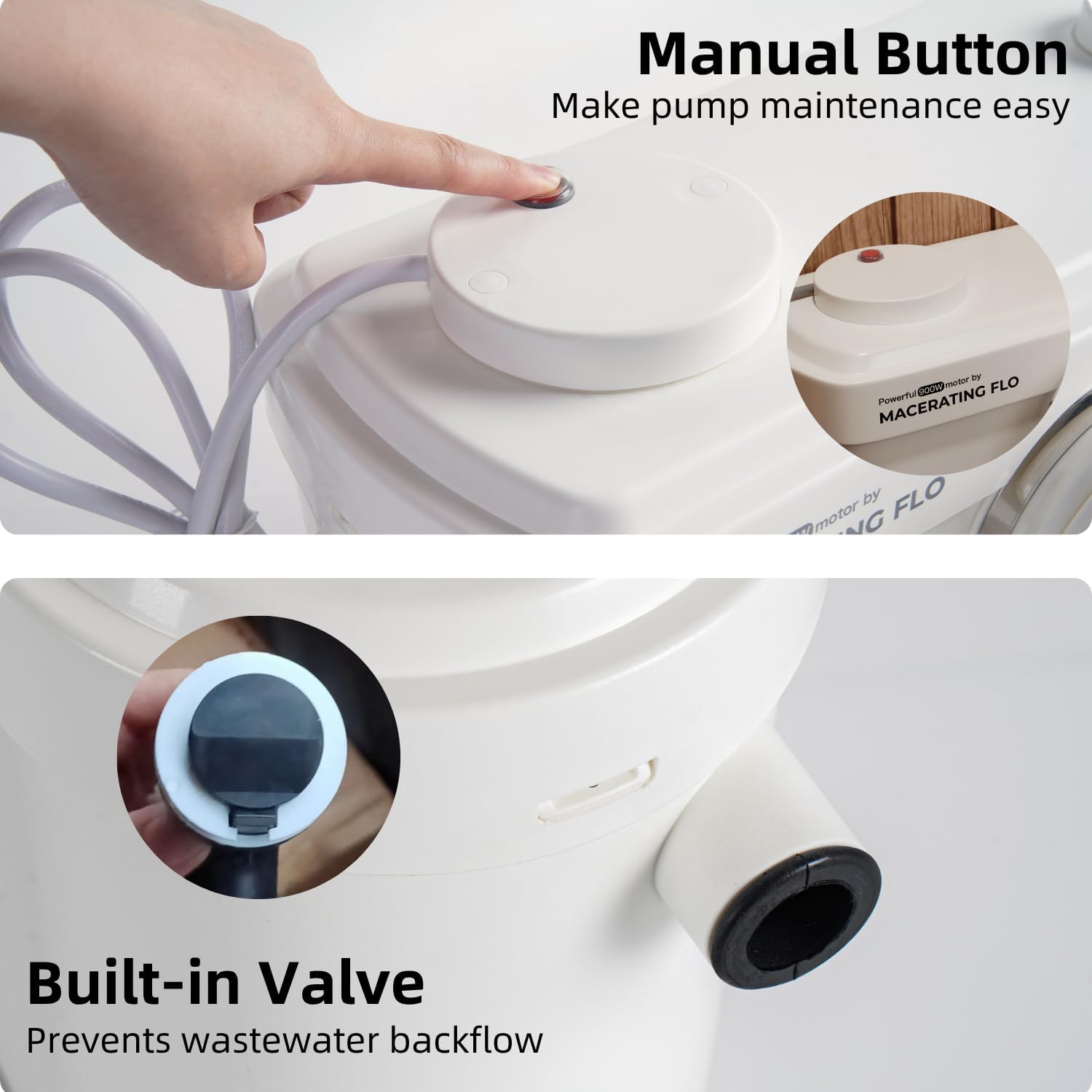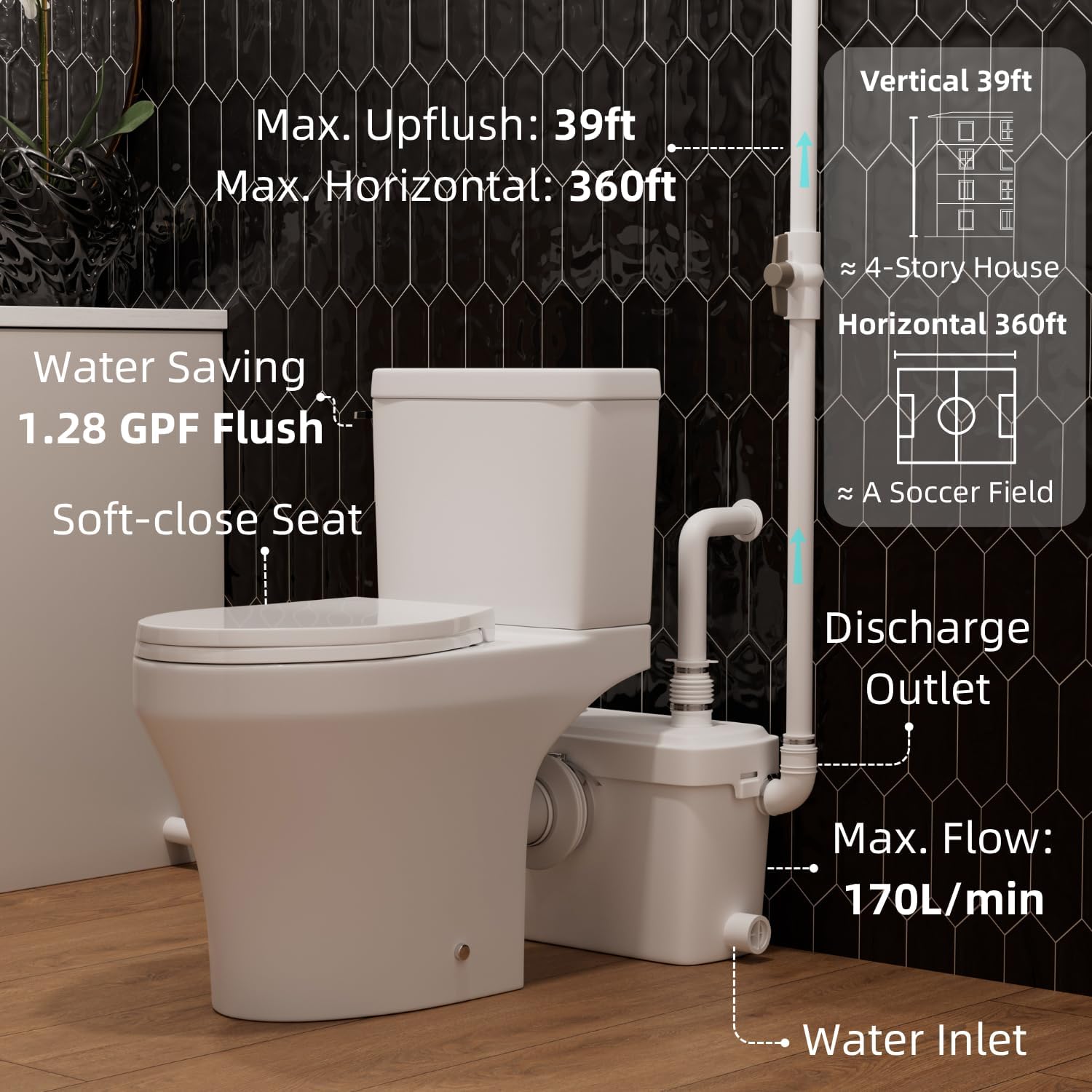 | Included Components | 900W Macerator Pump, Toilet Tank, Elongated Toilet Bowl, Toilet Seat, Fitting with Mounting Screws and Fasteners, Extension Pipes |