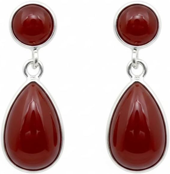 These stunning 925 sterling silver dangle earrings showcase the natural beauty of red carnelian gemstones in an elegant two-tier design. Each earring features a round carnelian cabochon at the top, gracefully connected to a larger pear-shaped carnelian drop below. The rich, warm red tones of the natural carnelian stones create a captivating look that catches the light beautifully. Handcrafted with attention to detail, these earrings are set in genuine sterling silver that complements the deep red hues perfectly. The classic drop style offers versatile wearability, making them suitable for both everyday elegance and special occasions. The smooth, polished carnelian stones are bezel-set in silver frames that enhance their natural luster while providing secure settings. These handmade earrings are perfect for women who appreciate the timeless appeal of natural gemstone jewelry combined with quality sterling silver craftsmanship.