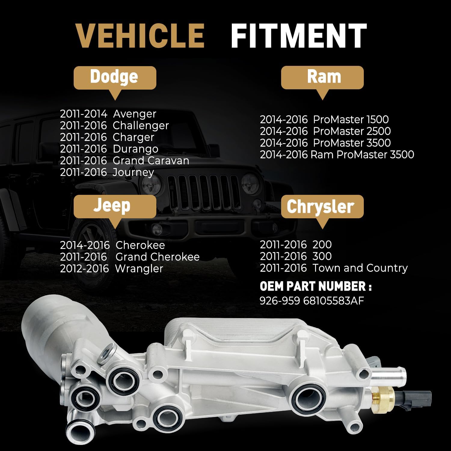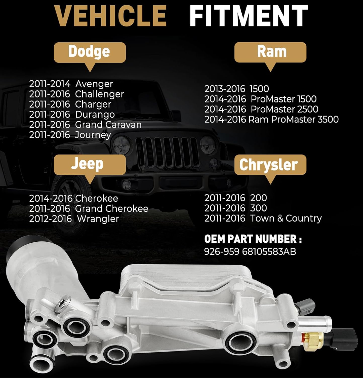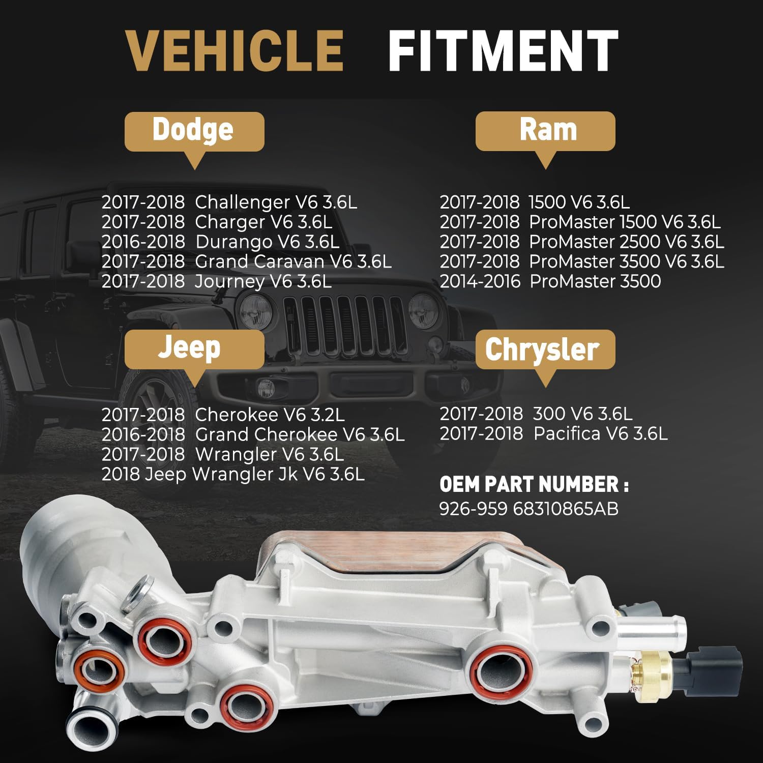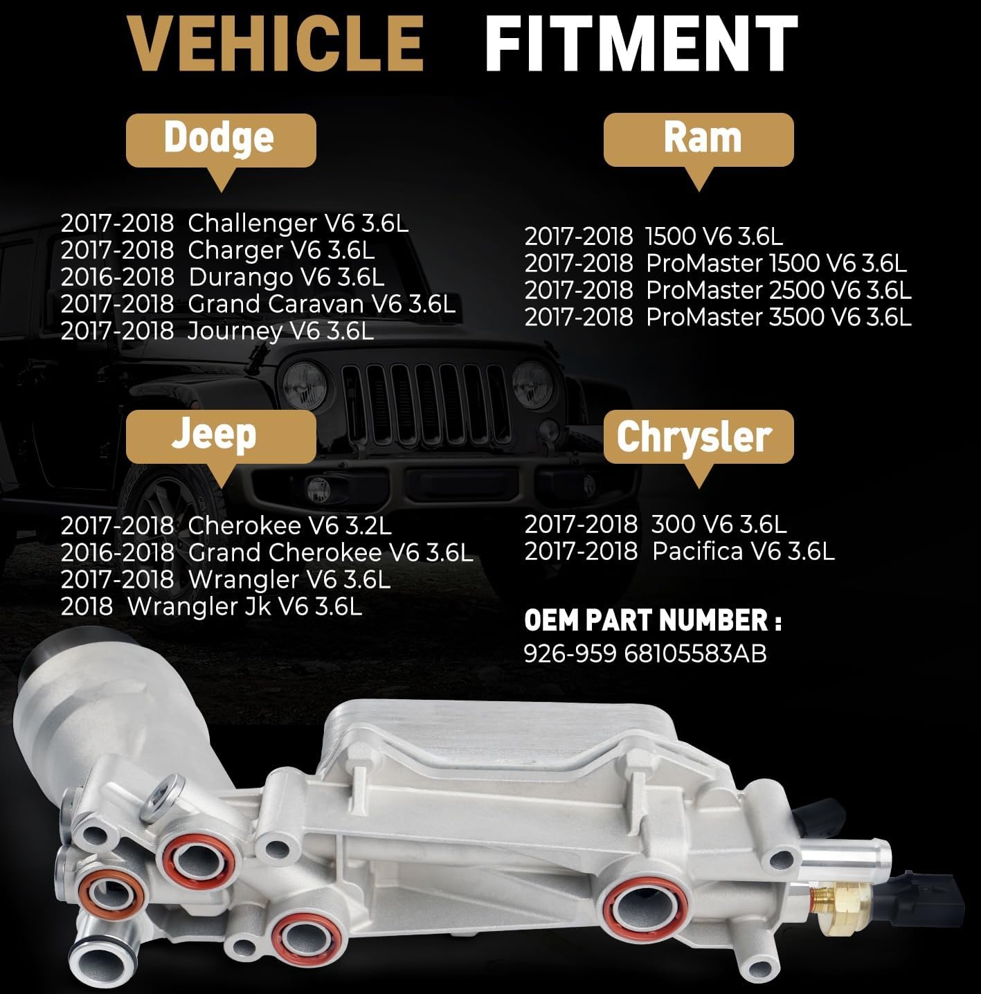 VEHICLE FITMENT:2017-2018 Chrysler 300 V6 3.6L2017-2018 Chrysler Pacifica V6 3.6L2017-2018 Dodge Challenger V6 3.6L2017-2018 Dodge Charger V6 3.6L2016-2018 Dodge Durango V6 3.6L2017-2018 Dodge Grand Caravan V6 3.6L2017-2018 Dodge Journey V6 3.6L2017-2018 Jeep Cherokee V6 3.2L2016-2018 Jeep Grand Cherokee V6 3.6L2017-2018 Jeep Wrangler V6 3.6L2018 Jeep Wrangler Jk V6 3.6L2017-2018 Ram 1500 V6 3.6L2017-2018 Ram ProMaster 1500 V6 3.6L2017-2018 Ram ProMaster 2500 V6 3.6L2017-2018 Ram ProMaster 3500 V6 3.6L