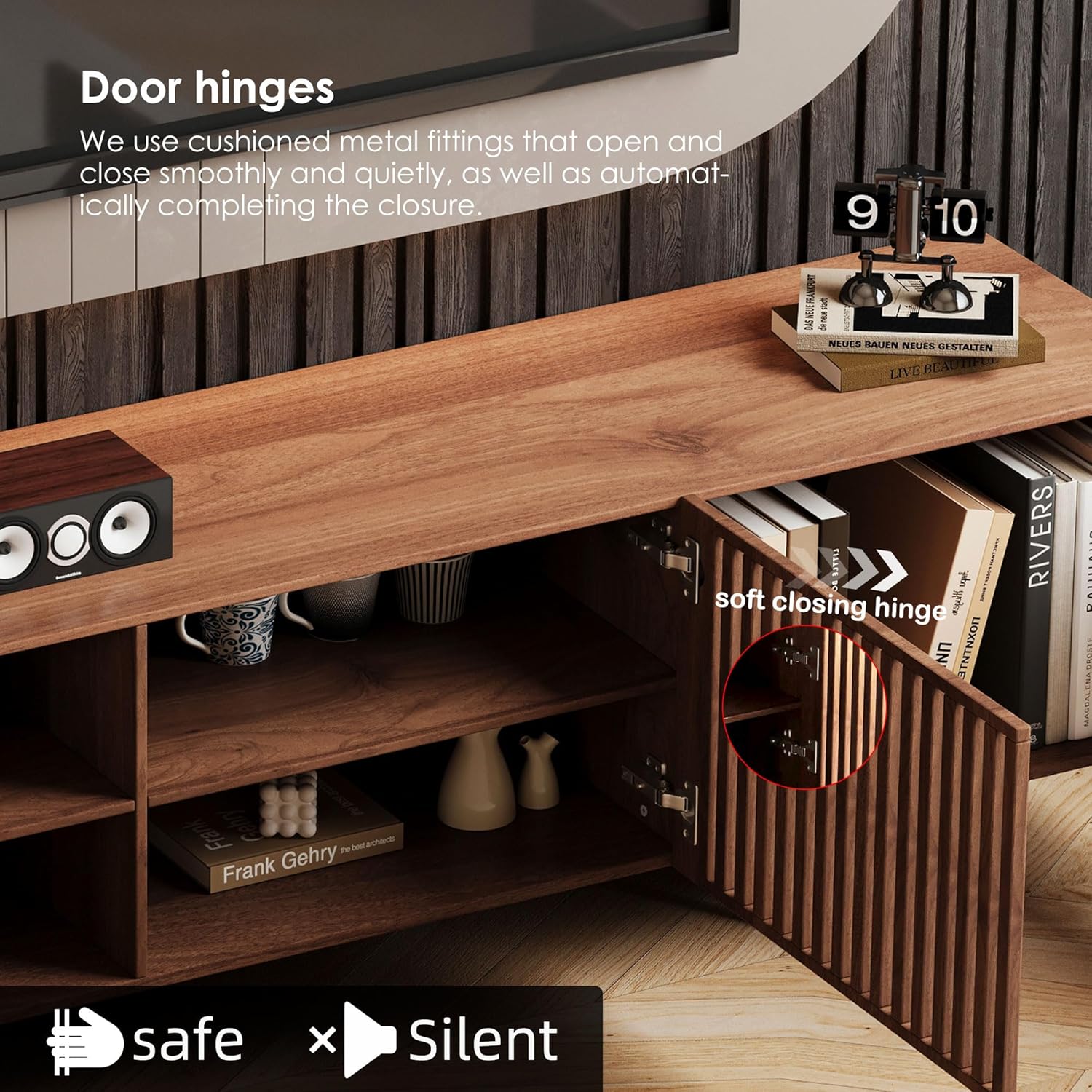 This Mid-Century Modern TV stand is designed for TVs up to 100 inches, offering a perfect blend of style, functionality, and generous storage. Its sleek walnut finish and clean lines make it an effortless match for a wide range of interior styles, from contemporary to retro-inspired spaces. Equipped with four spacious storage cabinets, the console provides ample room for media devices, books, décor, and everyday essentials. The cabinet doors help keep your items neatly organized and discreetly tucked away, maintaining a clean and clutter-free living area. Crafted from high-quality materials, the stand delivers lasting durability and stable support for large televisions. Assembly is straightforward, and all required hardware and instructions are included, ensuring a smooth and hassle-free setup experience.