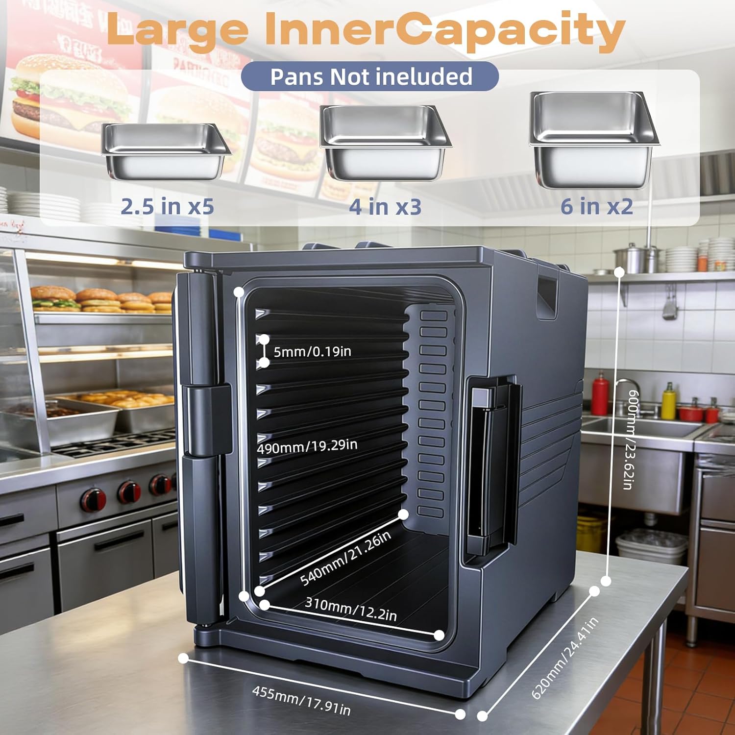 Keep Food Fresh & Flavorful with Our Professional Insulated Food Warmer Box! Whether you're a caterer, restaurant owner, or hosting a large event, our 95QT Insulated Food Warmer Box delivers unmatched performance and convenience. Designed with a robust double-walled LLDPE construction and thick polyurethane foam insulation, this non-electrical hot box maintains safe food temperatures for up to 6 hours—keeping hot dishes warm and cold items chilled without any power source. Why This Is the Ultimate Food Warmer Box? Superior Heat Retention: The embedded sealing ring lock in temperature effectively, outperforming standard models. Ample Storage Space: With internal dimensions of 490x540x310mm, it holds up to six 2.5" full-size pans (not included), making it perfect for large-volume transport. Effortless Portability: Top handles enable smooth, one-person movement—ideal for catering, food trucks, and outdoor events. Durable & Food-Safe: Made from food-grade LLDPE and featuring a plastic door shaft, this unit resists rust, dents, and wear, ensuring years of reliable use. Smart Features: The 270° door opening, menu slot, and stackable design enhance usability and space efficiency. Perfect for Every Scenario: Catering & Events: Serve as a catering food warmer or buffet warmer at weddings, corporate functions, and banquets. Food Delivery & Transport: Use as a hot food transport container for deliveries that stay fresh and warm. Outdoor & Travel: Excellent as a tailgate food warmer, camping companion, or portable party warmer. Home & Commercial Kitchens: A reliable non-electrical alternative to electric warmers for daily use or large gatherings. Technical Specifications: External Dimensions: 600x620x655mm Internal Dimensions: 490x540x310mm Capacity: 95 Quarts Material: Food-grade LLDPE,Palstic components Features: stackable, front-loading Upgrade your food transport today with a warmer box that combines capacity, durability, and smart design—all without electricity!