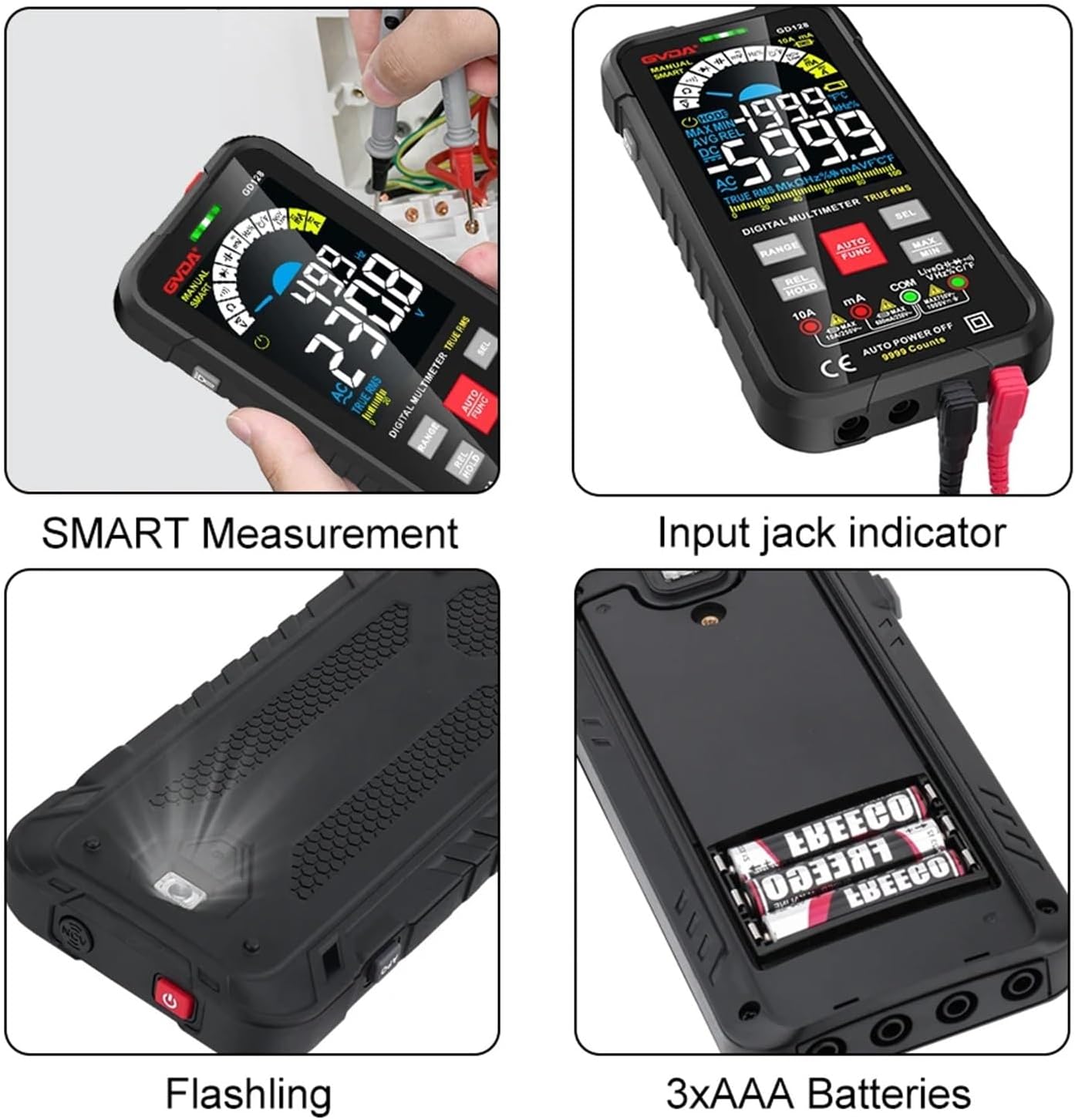 Battery protection board9999 Counts Smart Multimeter Digital True RMS Auto Range 1000V 10A Tester Ohm Hz Capacitance REL AC DC DMM MultitesterGVDA Multimeter is an Professional Multimeter which can measure AC and DC voltage, AC and DC current, resistance, capacitance, continuity, diode, NCV,etc.; It is the best choice for professional electrician, engineer, electronic enthusiast or family use.Product Features1) ColourLarger HD LCD Display2) Maximum display: Maximum 9999 Counts display3) Auto range and Manual Range4) Sampling Rate: About 3 times per second5) Over range display: the highest position shows "OL"6) Low voltage display: low battery indication<;80%8) Power Supply: 3x1.5V Batteries ( NOT include)9) Input Jack Led Indication10) It is a stable performance, high precision, high reliability clear readings, and overload protection.Technical DetailsFunctionsRangeAccuracyDC Voltage99.99mV/999.9mV; 9.999V/99.9V/1000V(0.5%+3)AC Voltage99.9mV/999.9/mV; 9.999V/99.9V/750V(0.8%+3)DC Current9.999mA/99.99mA/999.9mA(0.8%+3)9.99A(1.2%+3)AC Current9.999mA/99.99mA/999.9mA(1.0%+3)9.99A(1.5%+3)Resistance999.9ohm/9.999k/99.99k/999.9kohm(1.0%+5)9.999m/99.99mOhm(2.0%+10)Capacitance9.999/99.99/999.9nF/9.999/99.99/999.9uF(4.0%+3)9.999mF/99.99mF(5.0%+5)Frequency99.99/999.9/9.999k/99.99k/999.9kHz/9.999mHz(1.0%+3)Duty01.%-99.99%(1.0%+2)Temerature C/F-401000C; -40-1832F 2CCounts9999 countsDisplayVA Colour Display ScreenSmart Function(AC/DC Voltage,resistance and continuity)V Auto Identification of current inputV Relative MeasurementV Max/MinV NCV/Live/Continuity testV (sound and light alarm)Diode testV (sound alarm)Ba