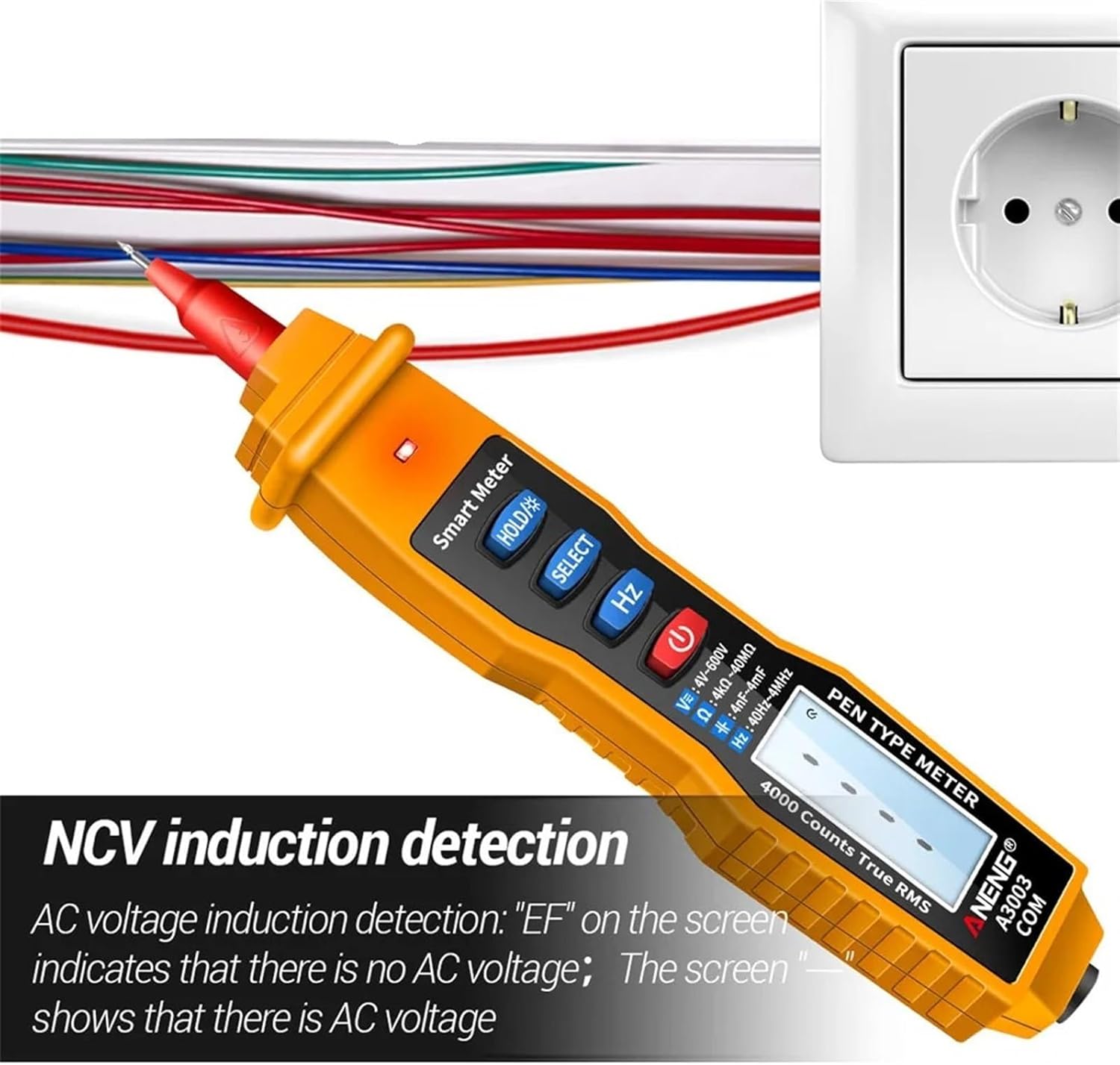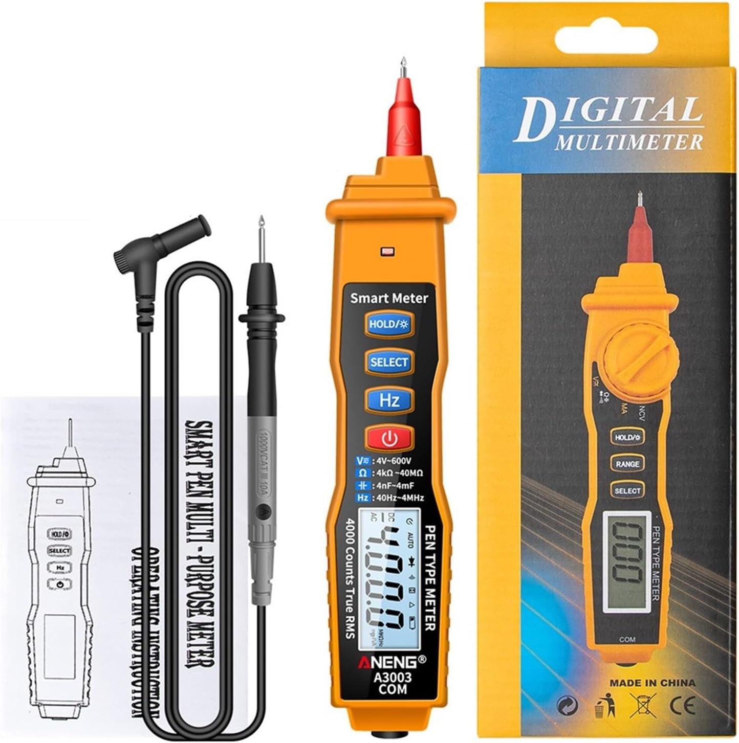 Multimeters & AnalyzersA3003 Digital Multimeter Pen Type Meter 4000 CountsFeatures:Measuring AC / voltageMeasuring resistanceMeasuring capacitanceNon-contact voltage detectionData retentionHertzInduction detectionOn-off buzzer detectionZero fire detectionSound/light alarmAutomatic shut-downBacklit bright screenSpecification:ModelA3003RangeAccuracy Voltage4V/40V/400V±(0.8%+3)600V±(1%+3)AC Voltage4V/40V/400V±(1%+3)600V±(1.2%+5)Capacitance4nF/40nF/400nF/4uF/40uF/400uF±(3%+5)4mF±(5%+10)Resistance4k/40k/400k/4M±(1%+5)40M±(1.2%+8)Frequency40Hz/400Hz/4kHz/40kHz/400kHz±(0.8%+8)4MHz±(1.2%+8)Package included:1 *pen multimeter(not including battery)1 * Tester line1 * User Manual==========Is Smart Device : noOperating Mode : auto MultimeterMeasuring Capacitance Range : 4nF/40nF/400nF/4uF/40uF/400uF/4mFOperating Temperature : 0 - 40 DIY Supplies : ELECTRICALMeasuring Resistance Range : 4k/40k/400k/4M/40MModel Number : A3003 Digital MultimeterMeasuring Inductance Range : A3003 Digital MultimeterDimensions : - Current : -AC Current : -AC Voltage : 4V/40V/400V/600V Voltage : 4V/40V/400V/600VDisplay Type : Digital display Model : A3003