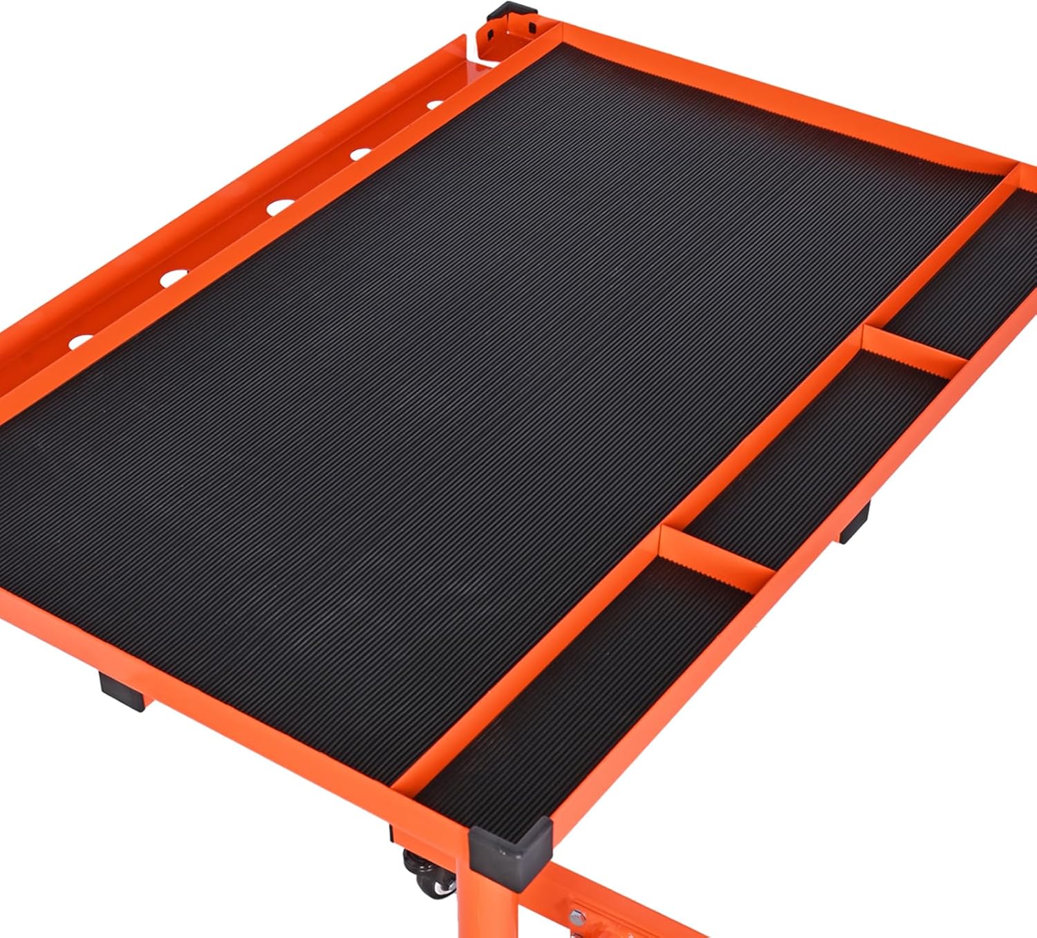 Heavy Duty Adjustable Work Table with Wheels Rolling For Garage , 200 lbs Capacity Tool Tray With Wheels 1: Portable Tear Down Tray ranges from 36. 6-49. 6 inches, telescoping post control. 2: Built by heavy durable steel, our 220 lbs capacity work table is so durable. 3: Includes top tray liner for air tools, screwdrivers and pry bars. 4: Four heavy duty swiveling casters allow for 360 degrees movement, It’ll make your work more pleasant and more efficient. 5: Mobile Work Table With Wheels the pre-punched mounting holes and accurate parts would save your much time with some hardware.