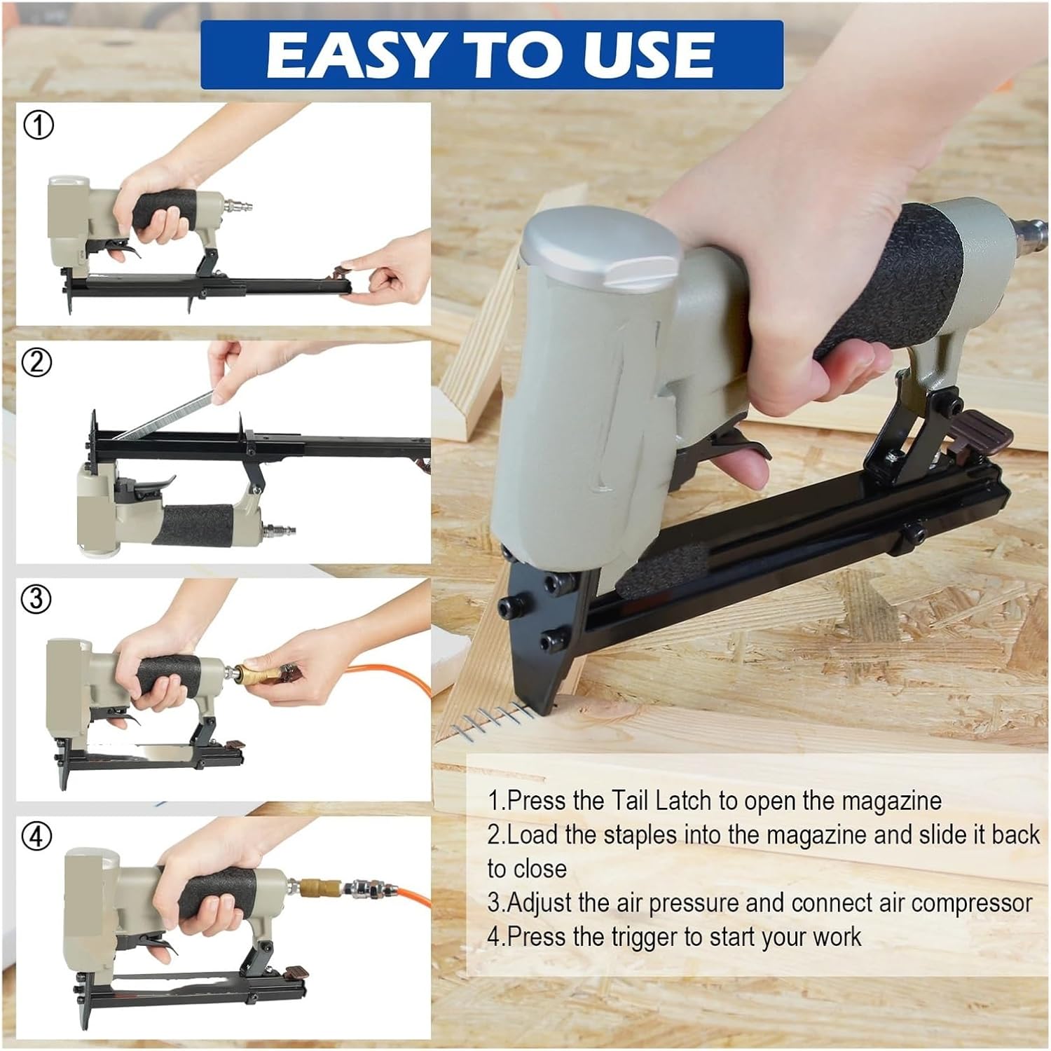 1. By manually turning the depth adjustment wheel, you can change the driving depth of various engineering and material staples.2. Features comfortable grip and 360° adjustable exhaust.3. Easy bottom loading and quick removal of clog release.