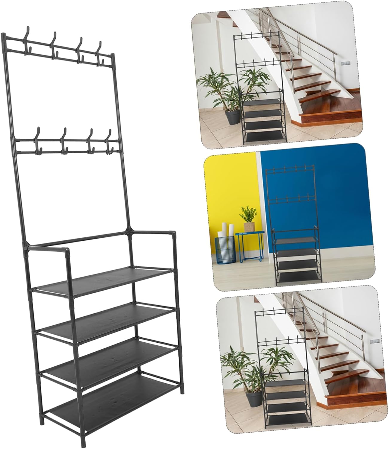 Package Include 1 x shoe rack Characteristics -Material:Iron slipper shelf -Stable and practical: the freestanding design ensures stability and can accommodate multiple items, suitable for home or office use shoe stand -Size:158.00X60.00X28.00cm/62.09X23.58X11.00in entryway coat stand -Multi-purpose organizer: provides a comprehensive solution for storing shoes, coats, and hats, keeping your space organized entryway coat hanger -Aesthetic design: the simple and modern design fits seamlessly into any decor, enhancing the overall aesthetic of your tier shoe organizer -Simple assembly: designed for easy and quick assembly without the need for tools, saving you shoe rack -Practical iron: made from sturdy iron, this rack is resistant to deformation, ensuring longterm use multi-tier shoe rack -Color:Black slipper storage rackGoods Descriptionbedroom shoe organizer Its sturdy build and modern design make it a functional and attractive addition to any entryway or bedroom.simple multi-tier shoe rack The multi-tier structure provides ample space for shoes, while the hooks are ideal for coats and hats.entryway shoe shelf This space-saving shoe rack with coat hanger is designed to maximize storage in small areas