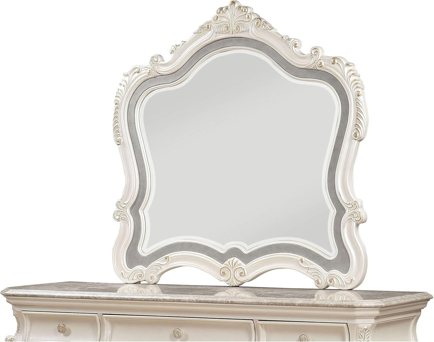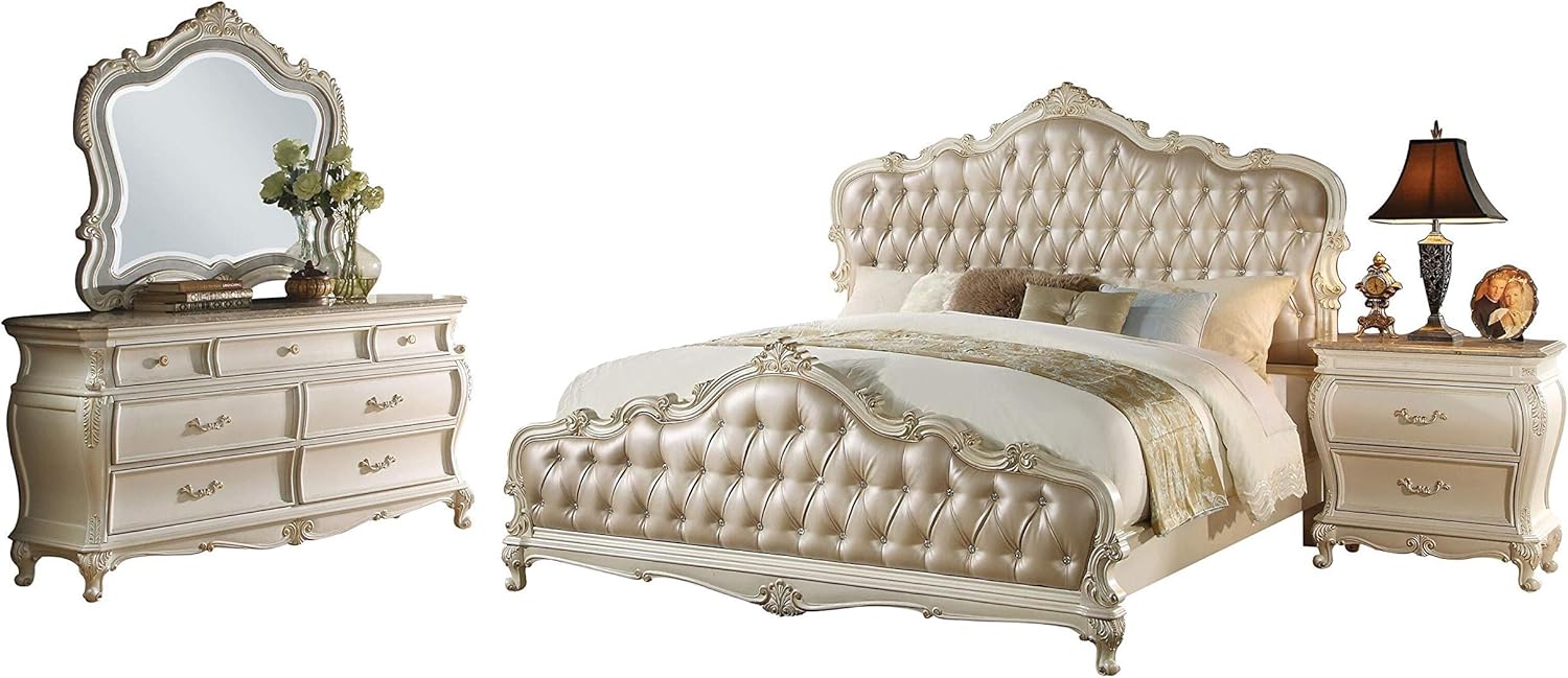 Items included in 4 Piece set: 1 Eastern King Bed, 1 Dresser, 1 Mirror, 1 Nightstand. Designed exclusively for ACME, the Chantelle bedroom collection is filled with romantic wonder. The French rococo button tufted headboard and footboard complemented with a broad selection of granite top case pieces to create a perfect suite for any bedroom in the house. The versatile style of the Chantelle bedroom allows this group to be a center piece to any Decor. Finish: Rose Gold PU & Pearl White Finish, Material: Wood, Upholstery, Veneer (Wood)